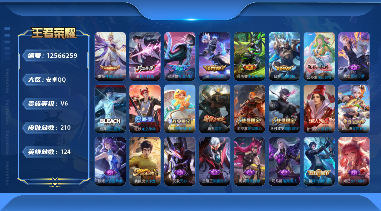 [12566259]【商品标题】:安卓Q-V6-至尊星耀III段位-124英雄-210皮肤-1典藏-0珍品无双-0无双-1珍品传说-4传说-52史诗