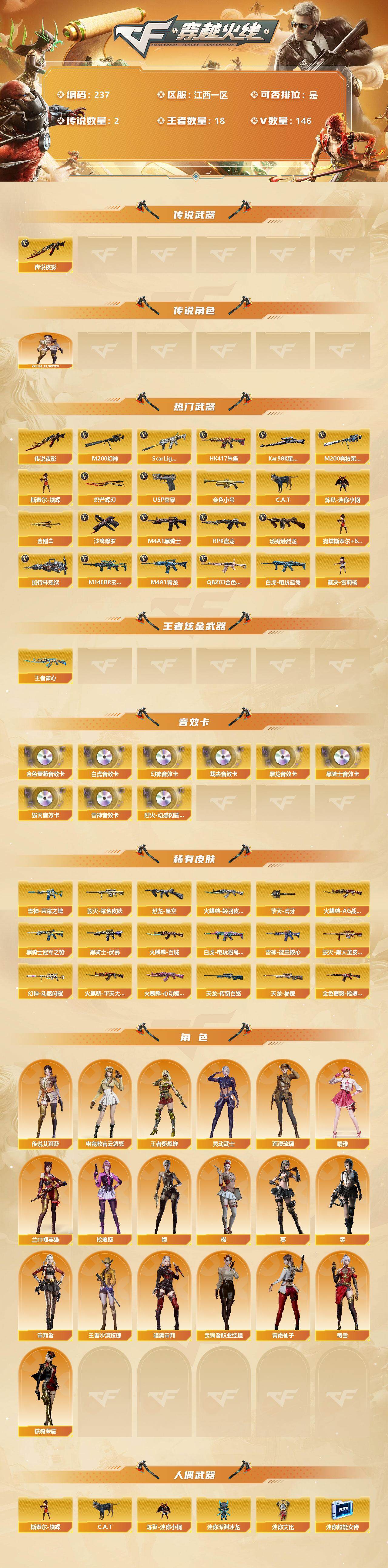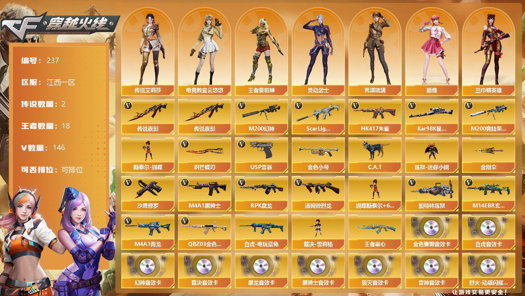 [12569006]【237】136V/102级/荣耀元首/2传说/18王者/10英雄/传说夜影/传说艾莉莎/QBZ03-金色蔷薇/M14EBR-玄武/Scar Light-白虎/HK417-朱雀/M4A1青龙/M200-幻神/M200-竞技荣光/白虎-电玩蓝兔/Kar98k-星神/金色小号/C.A.T/炼狱-迷你小钢/M4A1-黑骑士/汤姆逊-烈龙/RPK-盘龙/加特林-炼狱/斯泰尔蝴蝶/裁决-雪莉杨/USP雷暴/沙鹰-修罗/炽芒蝶刃/金刚伞/蝴蝶斯泰尔+6烈龙/王者霜心/烈火动感闪耀音效卡/M200-幻神音效卡/M4A1-雷神音效卡/M4A1-黑龙音效卡/M4A1-黑骑士音效卡/Barrett-毁灭音效卡/金色蔷薇音效卡/AWM-裁决音效卡/白虎音效卡/幻神动感闪耀/白虎-电玩粉兔/金色蔷薇-枪娘阿敏/雷神-能量核心/雷神荣耀之魄/火麒麟-AG战队皮肤/火麒麟-轻羽皮肤/火麒麟-平天大圣/火麒麟-百城/火麒麟-心动糖果/黑骑士-冠军之势/黑骑士-伏羲/毁灭耀金皮肤/毁灭-黑大圣皮肤/天龙-秘银/AWM-天龙-传奇白鲨/烈龙-星空/擎天-虎牙平台皮肤/王者-葵-貂蝉/王者-沙漠玫瑰/灵狐者-职业经理/审判者/零/葵/樱/瞳/电竞教官-云悠悠/荒漠琉璃/枪娘 樱/兰-巾帼英雄/晴雅/蜀雪/铁骑荣耀/灵动武士/暗黑审判/青霞仙子/火麒麟-灵狐/巴雷特-零-水下丽影/王者Barrett-英勇金戈/AWM-灵狐-15周年嘉年华/王者M200-无畏金戈/M4A1-雷神-精英刀锋/M37-葵/COP-旗袍/迷你深渊冰龙/迷你艾比/迷你超能女侍/迷你裂空之翼/夺魂/迷你牛牛/迷你生化手雷/灵狐娃娃手雷/深渊终结者手雷/闪光弹-小乔/闪光弹-貂蝉/高爆手雷-大乔/双面神/超级对讲机/6烈龙/6盘龙/神圣爆裂者/阐释者/激光毁灭者/VEPR-12-金魔/AK47-冰龙粉碎者/冰龙粉碎者-白马银枪/USP神工天巧/唐刀神工天巧/柯尔特-竞技荣光/擎天-竞技荣光/高爆手雷-竞技荣光/烟雾弹-竞技荣光/闪光弹-竞技荣光/柯尔特-电竞装甲/马来剑夜魔/麒麟刺-堕天神/龙啸-堕天神/AK47-雷暴/斩神刀-雷暴/M4A1-武圣/Glock18-武圣/烈火-动感闪耀/天神-动感闪耀/屠龙-动感闪耀/手雷-动感闪耀/无影-神兵利器/M4A1-雷神/M4A1-黑龙/M4A1-玫瑰精灵/M4A1-死神/AK47-无影