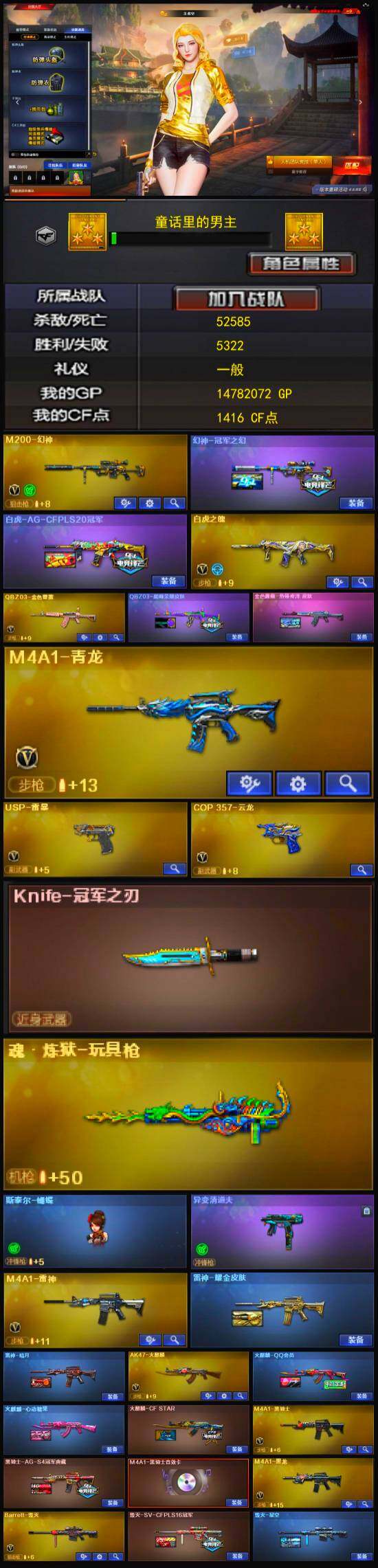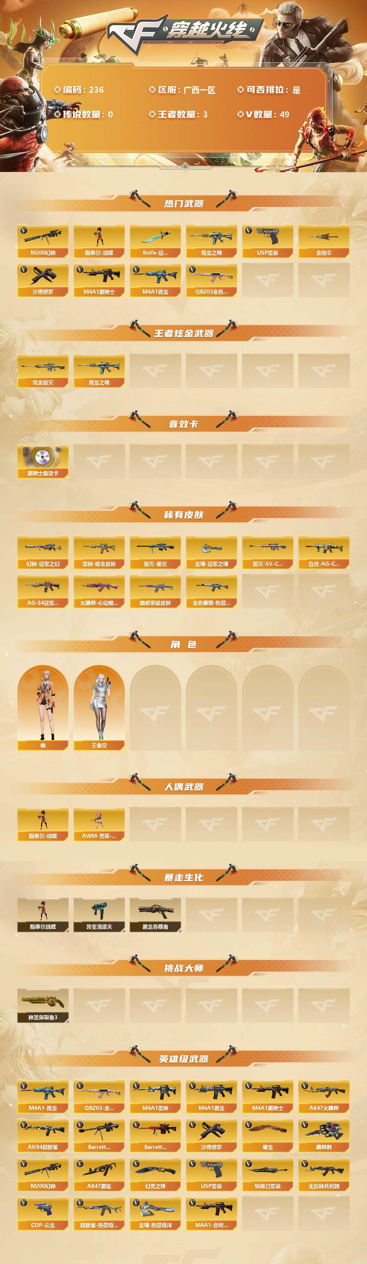 [12569094]【236】49V/92级/将帅/3王者/1炫金/QBZ03-金色蔷薇/M4A1青龙/M200-幻神/青龙之魄/M4A1-黑骑士/斯泰尔蝴蝶/USP雷暴/沙鹰-修罗/Knife-冠军之刃/金刚伞/炫金毁灭/M4A1-黑骑士音效卡/幻神冠军之幻/白虎-AG-CFPLS20冠军/QBZ03-巅峰荣耀皮肤/金色蔷薇-热带奇洋 皮肤/雷神-耀金皮肤/火麒麟-心动糖果/黑骑士-AG-S4冠军典藏/毁灭-星空/毁灭-CFPLS16皮肤/龙啸-冠军之啸/王者空/幽/AWM-灵狐-15周年嘉年华/异变清道夫/黑龙吞噬者/神圣爆裂者/COP357-云龙/幻灵之锋/斩神刀-雷暴/无影-神兵利器/M4A1-雷神/M4A1-黑龙/AK47-火麒麟/AN94-超新星/Barrett-毁灭/Barrett-极光/AK47-黑鲨/超新星-热带奇洋/M4A1-赤狱骑士/麒麟刺/屠龙/龙啸-热带奇洋