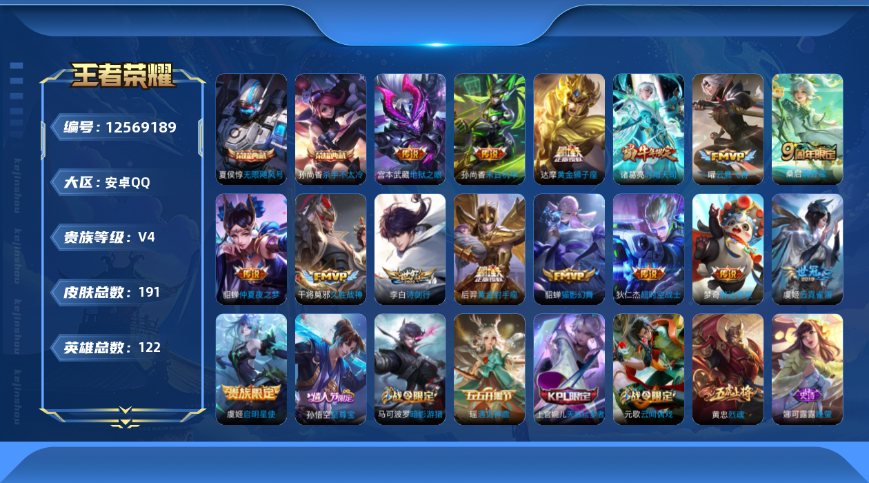 [12569189]【商品标题】:安卓Q-V4-尊贵铂金III段位-122英雄-188皮肤-2典藏-0珍品无双-0无双-0珍品传说-15传说-64史诗
