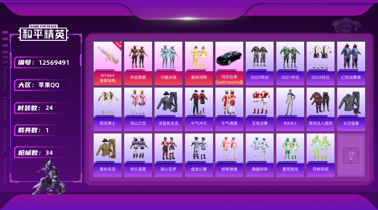 [12569491]【商品标题】:苹果 手Q-3粉装-1特效枪-1载具-0粉色飞行器-10565热力值-2王牌印记-24套装-34枪皮