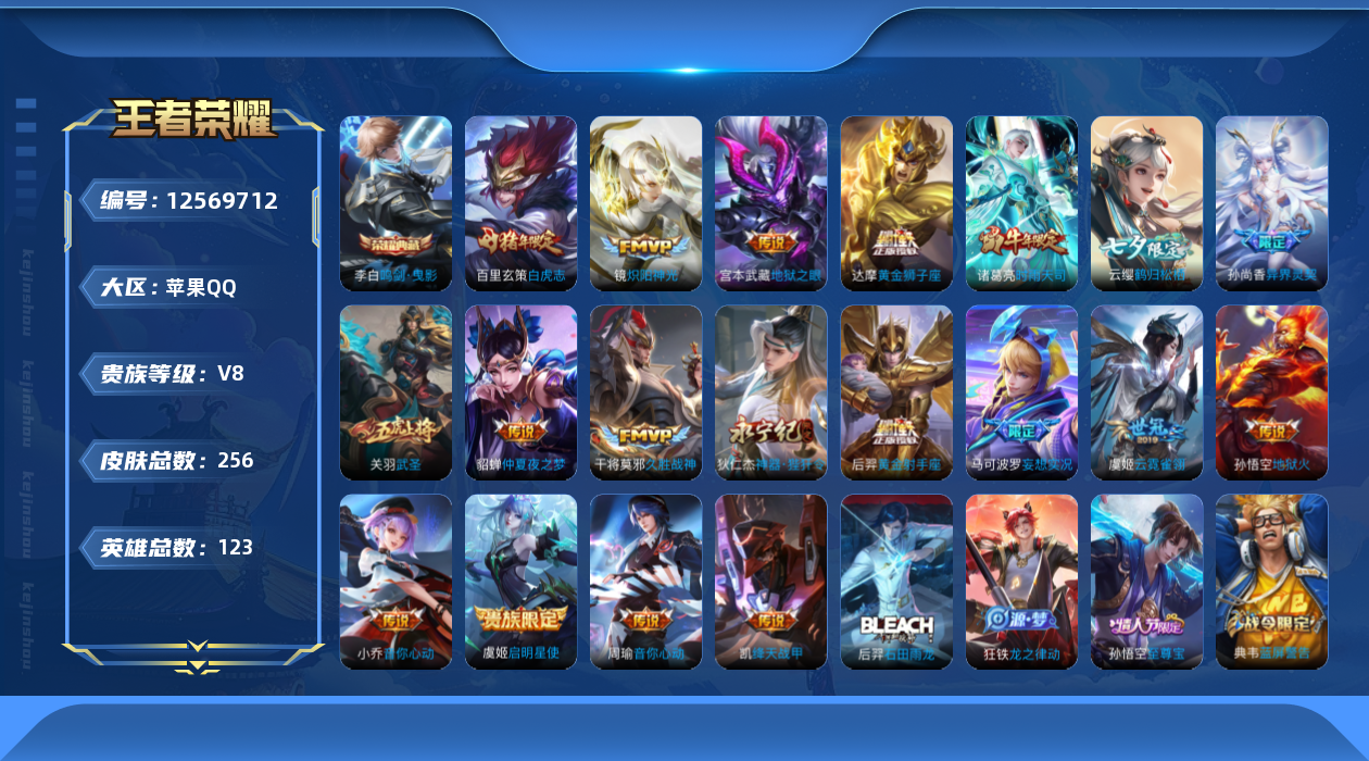 [12569712]【商品标题】:苹果Q-V8-永恒钻石II段位-123英雄-256皮肤-1典藏-0珍品无双-0无双-0珍品传说-19传说-70史诗