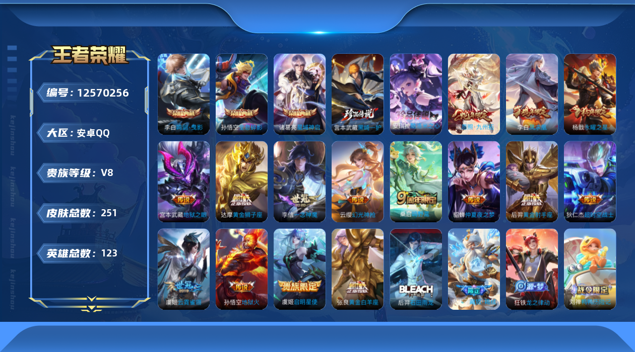 [12570256]【商品标题】:安卓Q-V8-至尊星耀III段位-123英雄-251皮肤-3典藏-0珍品无双-0无双-2珍品传说-15传说-68史诗