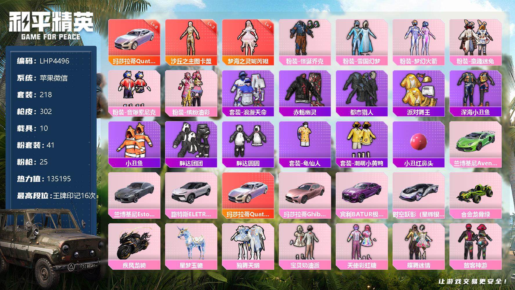[12570835]绝世印记4/玛莎拉蒂Quattroporte(幻星粉)(六级)/M416-至情至圣(九级)【特价急出/详情看图】:苹果 微信-2红装-41粉装-25特效枪-10载具-9粉色飞行器-13.5w热力值-16王牌印记-218套装-302枪皮【红色载具】:玛莎拉蒂Quattroporte(幻星粉)(六级)【红色神装等级】:梦海之灵-妮芮妲(一级),沙丘之主-图卡盟(三级)【热门品类】:粉装-怪诞乔克,粉装-雪国幻梦,粉装-梦幻火箭,粉装-童趣迷兔,粉装-音爆索尼克,粉装-缤纷油彩,套装-浪漫天命,套装-赤蝎幽灵,套装-都市猎人,套装-派对舞王,套装-深海小丑鱼,套装-小丑鱼,套装-胖达团团,套装-胖达圆圆,套装-龟仙人,套装-潮萌小黄鸭,小丑红鼻头【粉色载具】:兰博基尼Aventador SVJ(翡翠绿),兰博基尼Estoque(银翼灰),路特斯ELETRE(花绽灰),玛莎拉蒂Quattroporte(幻星粉),玛莎拉蒂Ghibli(粉),宾利BATUR(极速紫),时空跃影(星辉银),合金龙骨(绿),疾风龙骑,星梦玉骢【粉色套装】:粉装-独舞天鹅,粉装-怪诞乔克,粉装-宝贝奶油派,粉装-天使彩虹糖,粉装-雪国幻梦,粉装-蝶舞迷情,粉装-梦幻火箭,粉装-缤纷油彩,粉装-放客神游,粉装-冰霜白皇,粉装-童趣迷兔,粉装-炙焰红王,粉装-星之彼岸,粉装-馨动时刻,角色-洛天依,角色-2号机款机体服,粉装-绚金瑰梦,粉装-甜心娃娃,粉装-精灵娃娃,粉装-酣梦娃娃,粉装-焦糖拿铁,粉装-碧影闪光,粉装-薄荷物语,粉装-妙趣可丽,粉装-灵感创作师,粉装-彩虹甜喵,粉装-甜蜜草莓,粉装-旋转彩虹,粉装-启明星,粉装-海螺星光,粉装-音爆索尼克,粉装-第五大道,粉装-挚爱序曲,角色-白勺歌姬,角色-呆萌星弥,角色-小可学妹,角色-电磁星,角色-光极星,角色-鸢尾晶梦,角色-狂花道·不知火舞,角色-羊梦糖心【粉色枪皮等级】:AKM-甜心宝贝(七级),SCAR-L-童趣迷兔(七级),SCAR-L-青春物语(一级),M416-风花雪月(一级),M416-至情至圣(九级),M416-超新星(三级),M416-墨龙九天(三级),GROZA-香水柠檬(七级),GROZA-焦糖拿铁(一级),GROZA-旋转彩虹(一级),AUG-星梦奇缘(三级),M762-甜心娃娃(五级),UMP45-雪国精灵(七级),