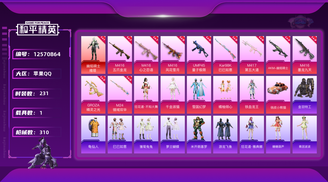 [12570864]【暑期末清货/特价急出/永久包赔/商品详情看图】:苹果 手Q-1红装-5粉装-10特效枪-1载具-10.1w热力值-19印记-231套装-310枪皮【热门品类】:绝对防御上衣,套装-金羽特工,套装-SS1特训【角色神装等级】:幽焰骑士-维塔(一级)【稀有载具】:俏皮小熊猫【特效枪等级】:AKM-幽焰骑士(三级),M416-五爪金龙(七级),M416-心之恋语(七级),M416-风花雪月(五级),M416-墨龙九天(三级),GROZA-精灵之光(三级),UMP45-量子极限(五级),Kar98K-巳巳如意(五级),M24-镜域双华(三级),M417-第五大道(四级)【优质套装】:粉装-雪国幻梦,粉装-铁血龙王,粉装-橘柚倾心,角色-狂花道·不知火舞,角色-千金淑猫【优质飞行器】:酣梦熊熊飞行器,终极赛罗飞行器,龙翔九天飞行器,曦光华影飞行器,幽焰列车飞行器,凤舞九天飞行器,万象金身飞行器