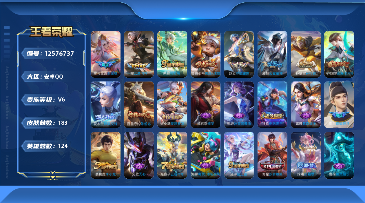[12576737]【商品标题】:安卓Q-V6-至尊星耀II段位-124英雄-183皮肤-0典藏-0珍品无双-0无双-0珍品传说-6传说-49史诗