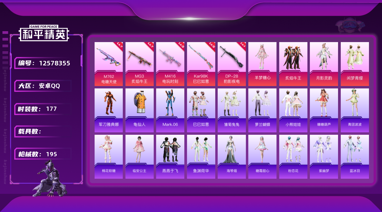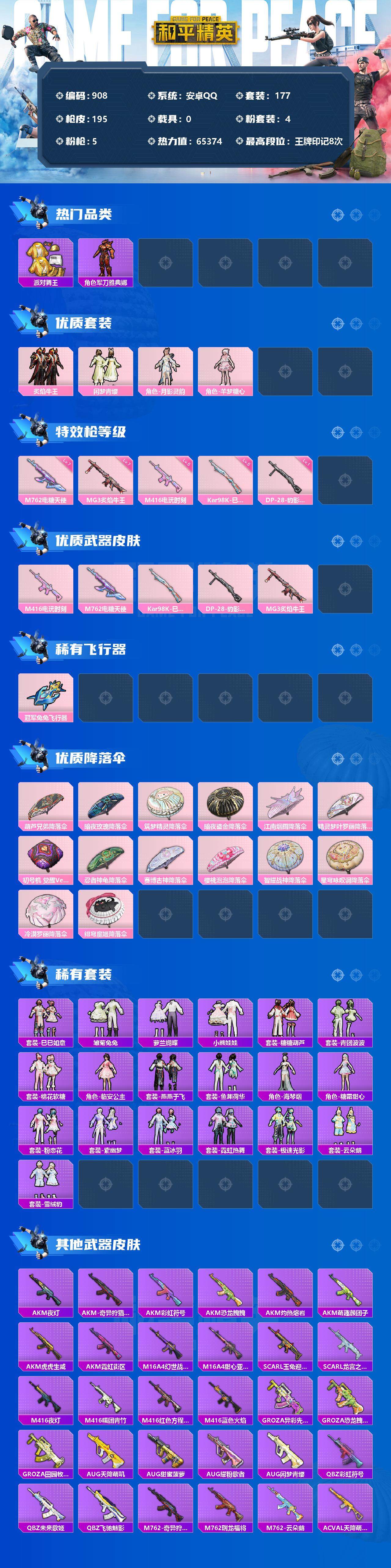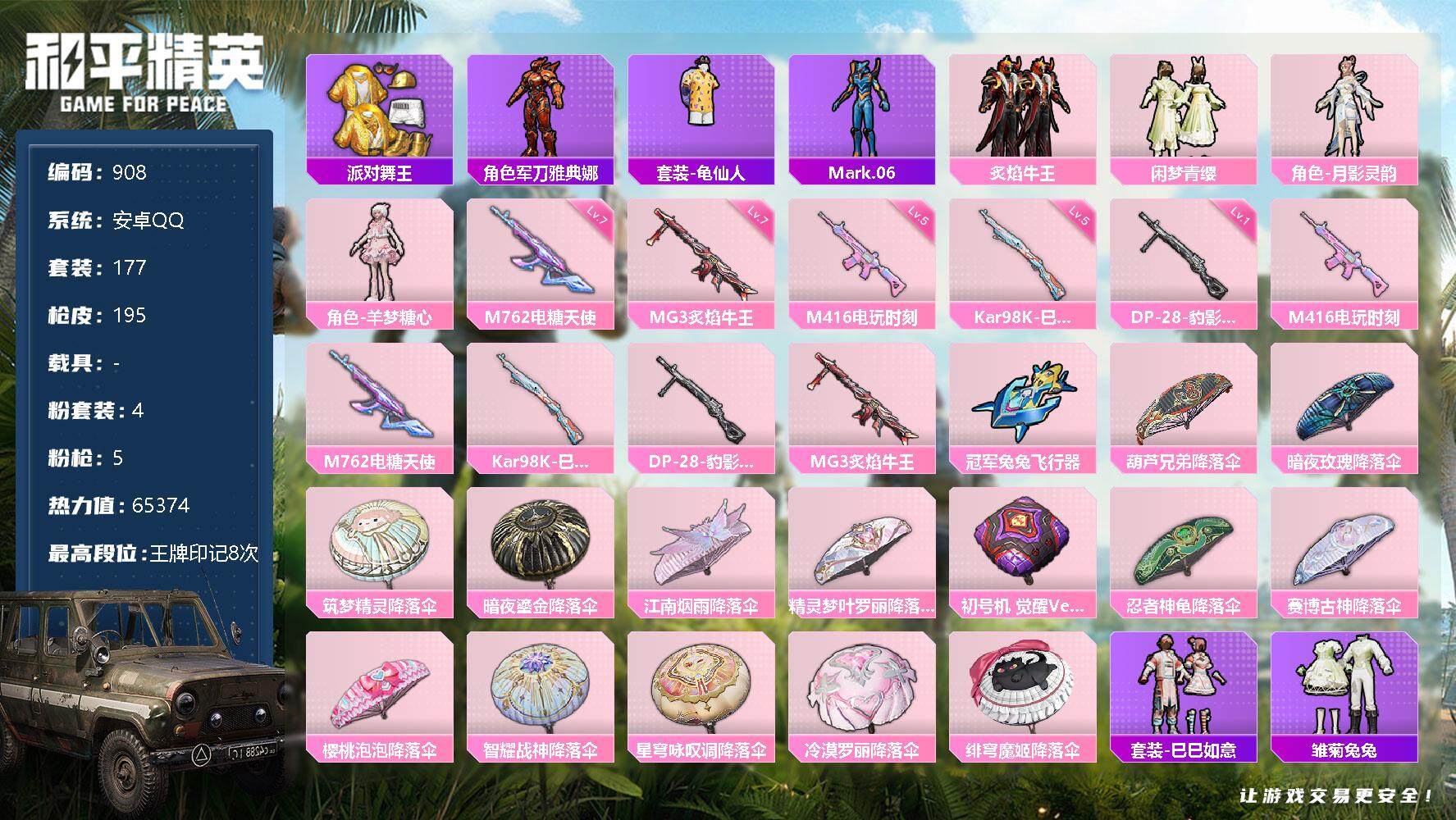 [12578355]安卓 手Q-4粉装-5特效枪-0载具-2粉色飞行器-65374热力值-8王牌印记-177套装-195枪皮 【热门品类】:套装-派对舞王,角色-军刀雅典娜,套装-龟仙人,角色-Mark.06 【粉色套装】:粉装-炙焰牛王,粉装-闲梦青缨,角色-月影灵韵,角色-羊梦糖心 【粉色枪皮等级】:M416-电玩时刻(五级),M762-电糖天使(七级),Kar98K-巳巳如意(五级),DP-28-豹影疾电(一级),MG3-炙焰牛王(七级) 【粉色枪皮】:M416-电玩时刻,M762-电糖天使,Kar98K-巳巳如意,DP-28-豹影疾电,MG3-炙焰牛王 【粉色飞行器】:冠军兔兔飞行器 【粉色降落伞】:葫芦兄弟降落伞,暗夜玫瑰降落伞,筑梦精灵降落伞,暗夜鎏金降落伞,江南烟雨降落伞,精灵梦叶罗丽降落伞,初号机 觉醒Ver.降落伞,忍者神龟降落伞,赛博古神降落伞,樱桃泡泡降落伞,智耀战神降落伞,星穹咏叹调降落伞,冷漠罗丽降落伞,绯穹魔姬降落伞 【稀有套装】:套装-龟仙人,套装-巳巳如意,套装-雏菊兔兔,套装-萝兰蝴蝶,套装-小熊娃娃,套装-糖糖葫芦,套装-青团波波,套装-棉花软糖,角色-临安公主,套装-燕燕于飞,套装-鱼渊荷华,角色-海琴烟,角色-糖霜甜心,套装-粉恋花,套装-紫幽梦,套装-蓝冰羽,套装-霓虹热舞,套装-极速光影,套装-云朵鹅,套装-雪绒豹 【稀有枪皮】:AKM-夜灯,AKM-奇异狩猎者,AKM-彩虹符号,AKM-恐龙拽拽,AKM-灼热熔岩,AKM-萌趣颜团子,AKM-虎虎生威,AKM-霓虹街区,M16A4-幻世战舞者,M16A4-甜心亚梦,SCAR-L-玉兔迎春,SCAR-L-龙宫之主,M416-夜灯,M416-糯团青竹,M416-红色方程式,M416-蓝色火焰,GROZA-异彩先驱,GROZA-恐龙拽拽,GROZA-田园牧歌,AUG-天降萌叽,AUG-甜蜜菠萝,AUG-耀粉歌者,AUG-闲梦青缨,QBZ-彩虹符号,QBZ-未来歌姬,QBZ-飞驰魅影,M762-奇异狩猎者,M762-瑞龙福将,M762-云朵鹅,AC-VAL-天降萌叽,AC-VAL-甜心亚梦,蜜獾-天降萌叽,蜜獾-娇憨猪猪,UZI-墨染幽兰,UZI-天降萌叽,UZI-娇憨猪猪,UZI-炫彩节奏,UZI-月影灵韵,UMP45-生命誓言,UMP45-蓝色火焰,Vector-焰鹰斗篷,Vector-生命誓