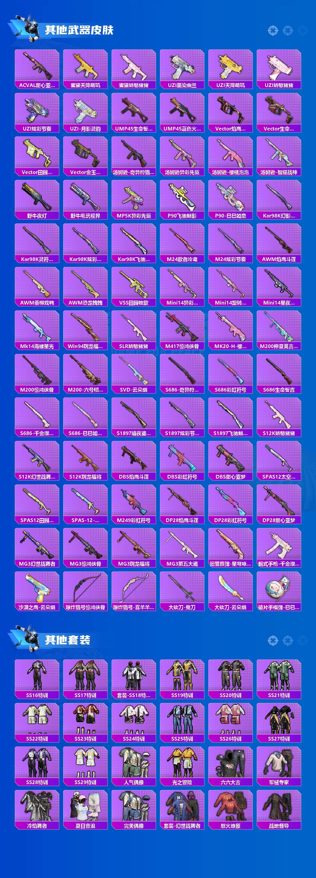 【稀有枪皮】:AKM-夜灯,AKM-奇异狩猎者,AKM-彩虹符号,AKM-恐龙拽拽,AKM-灼热熔岩,AKM-萌趣颜团子,AKM-虎虎生威,AKM-霓虹街区,M16A4-幻世战舞者,M16A4-甜心亚梦,SCAR-L-玉兔迎春,SCAR-L-龙宫之主,M416-夜灯,M416-糯团青竹,M416-红色方程式,M416-蓝色火焰,GROZA-异彩先驱,GROZA-恐龙拽拽,GROZA-田园牧歌,AUG-天降萌叽,AUG-甜蜜菠萝,AUG-耀粉歌者,AUG-闲梦青缨,QBZ-彩虹符号,QBZ-未来歌姬,QBZ-飞驰魅影,M762-奇异狩猎者,M762-瑞龙福将,M762-云朵鹅,AC-VAL-天降萌叽,AC-VAL-甜心亚梦,蜜獾-天降萌叽,蜜獾-娇憨猪猪,UZI-墨染幽兰,UZI-天降萌叽,UZI-娇憨猪猪,UZI-炫彩节奏,UZI-月影灵韵,UMP45-生命誓言,UMP45-蓝色火焰,Vector-焰鹰斗篷,Vector-生命誓
