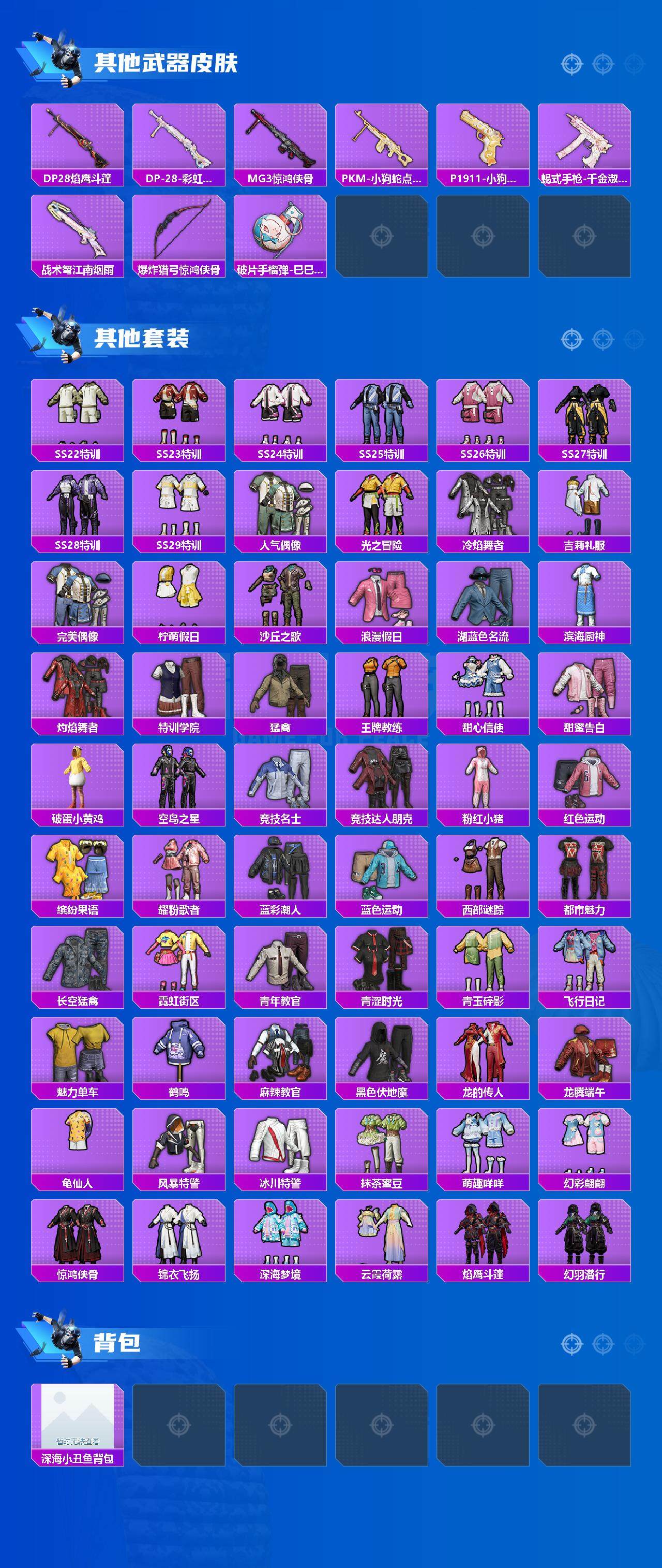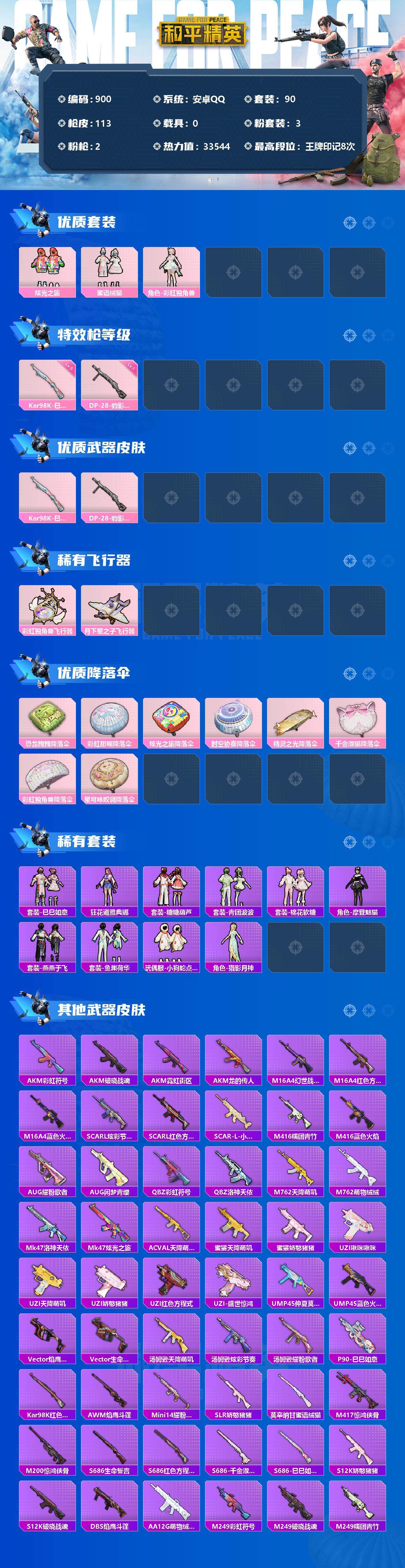 [12578403]安卓 手Q-3粉装-2特效枪-0载具-2粉色飞行器-33544热力值-8王牌印记-90套装-113枪皮 【热门品类】:套装-龟仙人,套装-粉红小猪 【粉色套装】:粉装-炫光之旅,粉装-蜜语绒猫,角色-彩虹独角兽 【粉色枪皮等级】:Kar98K-巳巳如意(五级),DP-28-豹影疾电(一级) 【粉色枪皮】:Kar98K-巳巳如意,DP-28-豹影疾电 【粉色飞行器】:彩虹独角兽飞行器,月下星之子飞行器 【粉色降落伞】:恐龙拽拽降落伞,彩虹甜喵降落伞,炫光之旅降落伞,时空协奏降落伞,精灵之光降落伞,千金淑猫降落伞,彩虹独角兽降落伞,星穹咏叹调降落伞 【稀有套装】:套装-龟仙人,套装-巳巳如意,角色-狂花道·雅典娜,套装-糖糖葫芦,套装-青团波波,套装-棉花软糖,角色-摩登魅猫,套装-燕燕于飞,套装-鱼渊荷华,玩偶服-小狗蛇点点,角色-猎影月神 【稀有枪皮】:AKM-彩虹符号,AKM-破晓战魂,AKM-霓虹街区,AKM-龙的传人,M16A4-幻世战舞者,M16A4-红色方程式,M16A4-蓝色火焰,SCAR-L-炫彩节奏,SCAR-L-红色方程式,SCAR-L-小狗蛇点点,M416-糯团青竹,M416-蓝色火焰,AUG-耀粉歌者,AUG-闲梦青缨,QBZ-彩虹符号,QBZ-洛神天依,M762-天降萌叽,M762-萌物绒绒,Mk47-洛神天依,Mk47-炫光之旅,AC-VAL-天降萌叽,蜜獾-天降萌叽,蜜獾-娇憨猪猪,UZI-啾咪啾咪,UZI-天降萌叽,UZI-娇憨猪猪,UZI-红色方程式,UZI-盛世惊鸿,UMP45-仲夏莫吉托,UMP45-蓝色火焰,Vector-焰鹰斗篷,Vector-生命誓言,汤姆逊-天降萌叽,汤姆逊-炫彩节奏,汤姆逊-耀粉歌者,P90-巳巳如意,Kar98K-红色方程式,AWM-焰鹰斗篷,Mini14-耀粉歌者,SLR-娇憨猪猪,莫辛纳甘-蜜语绒猫,M417-惊鸿侠骨,M200-惊鸿侠骨,S686-生命誓言,S686-红色方程式,S686-巳巳如意,S686-千金淑猫,S12K-破晓战魂,S12K-娇憨猪猪,DBS-焰鹰斗篷,AA12-G-萌物绒绒,M249-彩虹符号,M249-破晓战魂,M249-糯团青竹,DP-28-焰鹰斗篷,DP-28-彩虹独角兽,MG3-惊鸿侠骨,PKM-小狗蛇点点,P1911-小狗蛇点点,蝎式手枪-千金淑猫,战术弩-江南
