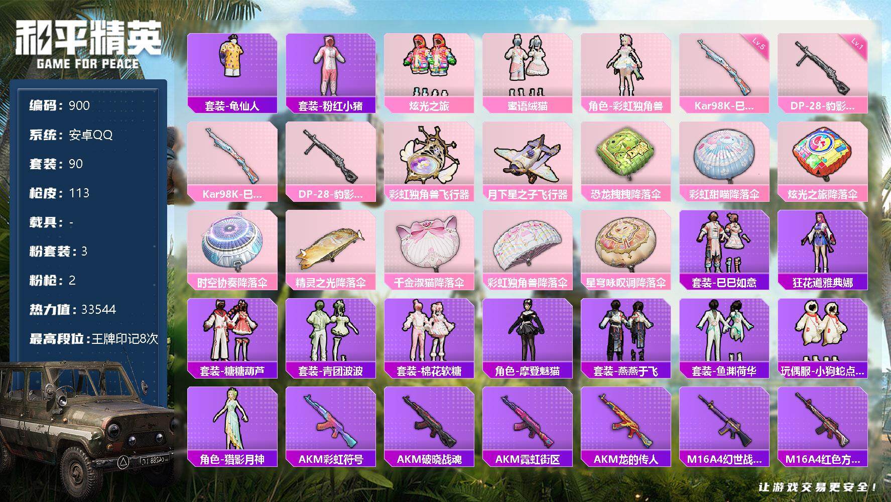 [12578403]安卓 手Q-3粉装-2特效枪-0载具-2粉色飞行器-33544热力值-8王牌印记-90套装-113枪皮