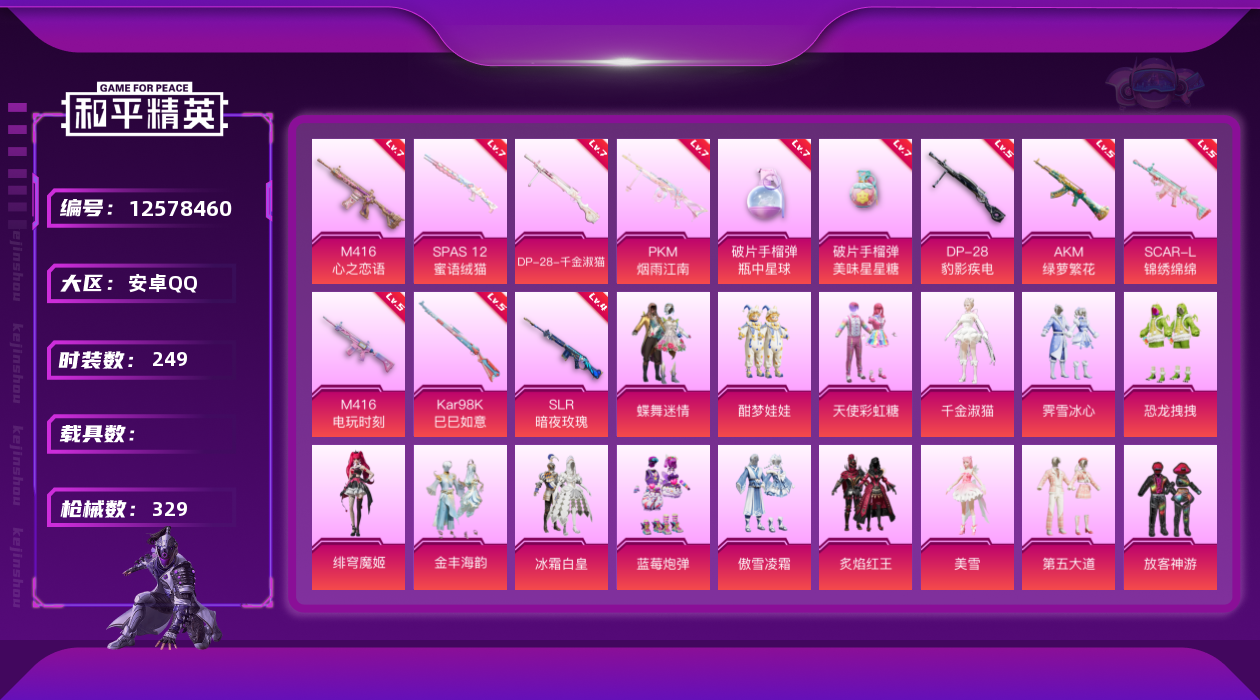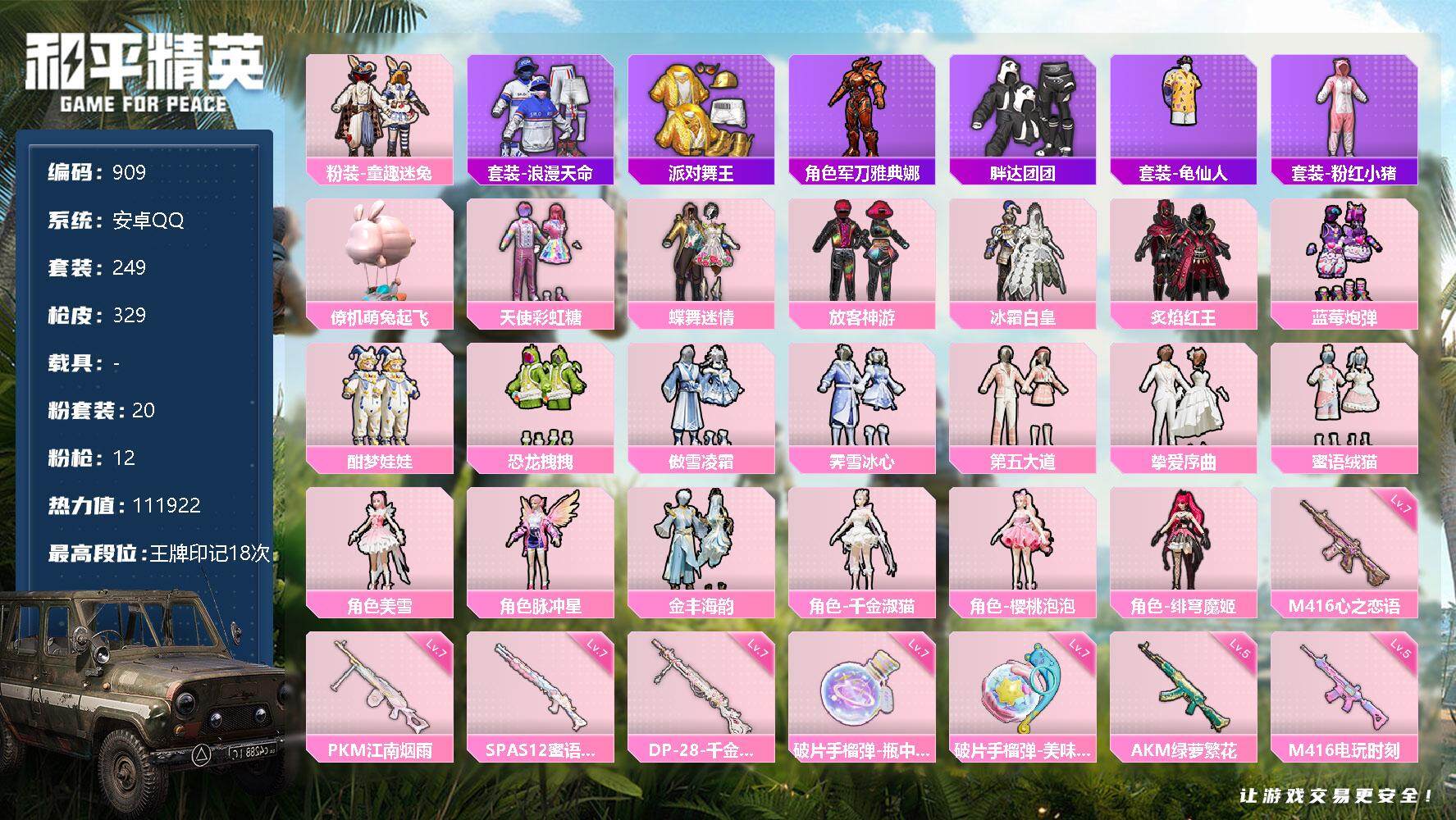 [12578460]安卓 手Q-20粉装-12特效枪-0载具-7粉色飞行器-111922热力值-18王牌印记-249套装-329枪皮