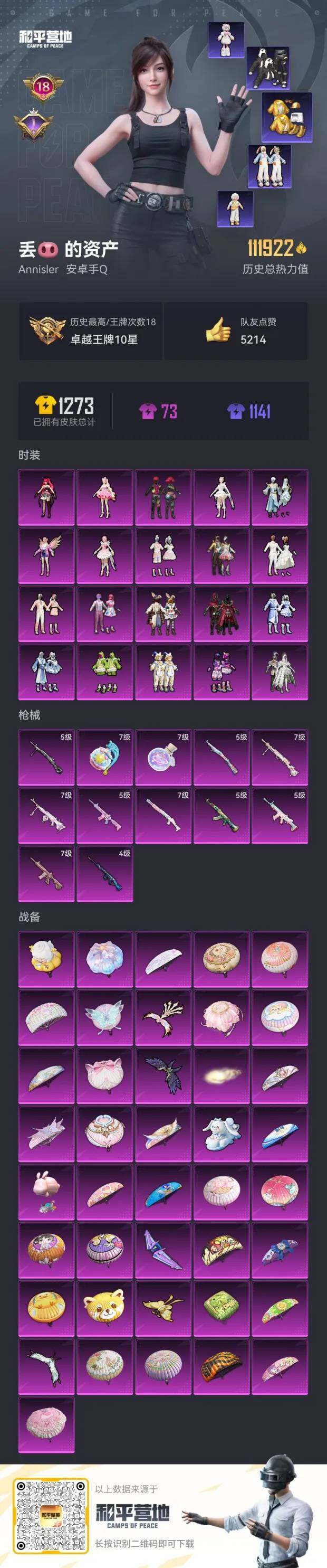 - PX_2097189- 安卓手Q-10王牌印记-10粉装-7特效枪-5载具-78874热力值-129套装-204枪皮-2卓越印记-0传奇印记 【10粉装】,宁雨蝶,羊梦糖心,傲傲奶龙,金曜白虎,木曜青龙,蔷薇星,猩猩队长,炫光之旅,脆鲨七海,烟云彩露 【7特效枪】AKM-梦之光华-5级 M416-风花雪月-1级 M416-墨龙九天-9级 AUG-超新星-7级 Kar98K-巳巳如意-5级 UMP4
