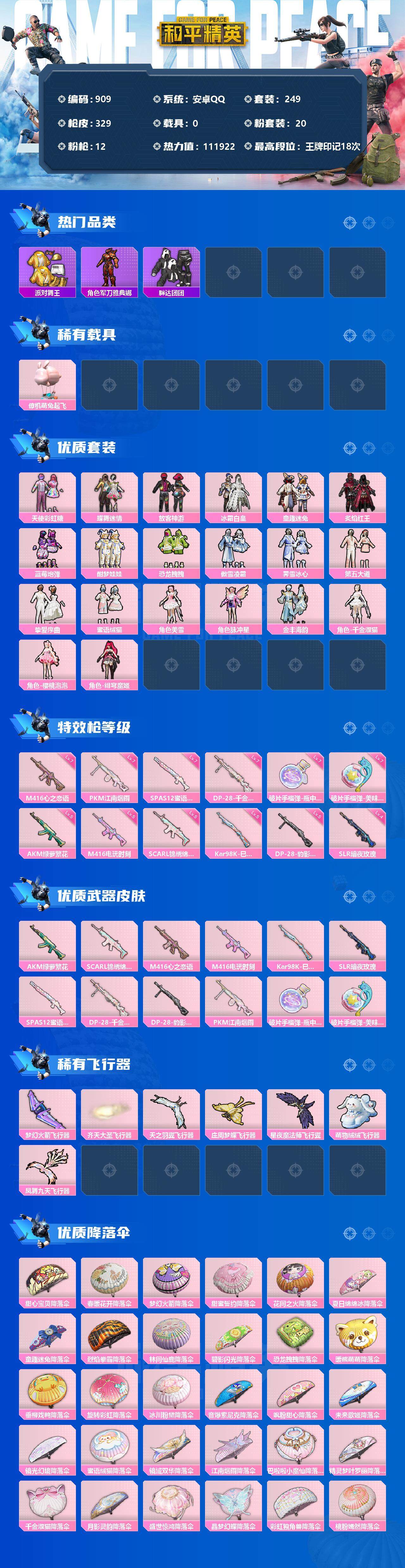 [12578460]安卓 手Q-20粉装-12特效枪-0载具-7粉色飞行器-111922热力值-18王牌印记-249套装-329枪皮 【热门品类】:粉装-童趣迷兔,套装-浪漫天命,套装-派对舞王,角色-军刀雅典娜,套装-胖达团团,套装-龟仙人,套装-粉红小猪 【粉色载具】:僚机-萌兔起飞 【粉色套装】:粉装-天使彩虹糖,粉装-蝶舞迷情,粉装-放客神游,粉装-冰霜白皇,粉装-童趣迷兔,粉装-炙焰红王,粉装-蓝莓炮弹,粉装-酣梦娃娃,粉装-恐龙拽拽,粉装-傲雪凌霜,粉装-霁雪冰心,粉装-第五大道,粉装-挚爱序曲,粉装-蜜语绒猫,角色-美雪,角色-脉冲星,粉装-金丰海韵,角色-千金淑猫,角色-樱桃泡泡,角色-绯穹魔姬 【粉色枪皮等级】:AKM-绿萝繁花(五级),SCAR-L-锦绣绵绵(五级),M416-心之恋语(七级),M416-电玩时刻(五级),Kar98K-巳巳如意(五级),SLR-暗夜玫瑰(四级),SPAS-12-蜜语绒猫(七级),DP-28-千金淑猫(七级),DP-28-豹影疾电(五级),PKM-江南烟雨(七级),破片手榴弹-瓶中星球(七级),破片手榴弹-美味星星糖(七级) 【粉色枪皮】:AKM-绿萝繁花,SCAR-L-锦绣绵绵,M416-心之恋语,M416-电玩时刻,Kar98K-巳巳如意,SLR-暗夜玫瑰,SPAS-12-蜜语绒猫,DP-28-千金淑猫,DP-28-豹影疾电,PKM-江南烟雨,破片手榴弹-瓶中星球,破片手榴弹-美味星星糖 【粉色飞行器】:梦幻火箭飞行器,齐天大圣飞行器,天之羽翼飞行器,庄周梦蝶飞行器,星夜魔法师飞行翼,萌物绒绒飞行器,凤舞九天飞行器 【粉色降落伞】:甜心宝贝降落伞,春暖花开降落伞,梦幻火箭降落伞,甜蜜誓约降落伞,花间之火降落伞,夏日绵绵冰降落伞,童趣迷兔降落伞,烈焰拳霸降落伞,林间仙鹿降落伞,碧影闪光降落伞,恐龙拽拽降落伞,暖熊萌萌降落伞,垂柳戏鸭降落伞,旋转彩虹降落伞,冰川粉黛降落伞,音爆索尼克降落伞,飒粉甜心降落伞,未来歌姬降落伞,镜光幻境降落伞,蜜语绒猫降落伞,镜域双华降落伞,江南烟雨降落伞,巴啦啦小魔仙降落伞,精灵梦叶罗丽降落伞,千金淑猫降落伞,月影灵韵降落伞,盛世惊鸿降落伞,晶梦幻蝶降落伞,彩虹独角兽降落伞,桃粉嫣然降落伞,星穹咏叹调降落伞,荧海星豚降落伞,喜羊羊与灰太狼降落伞 【稀有套装】:套装-龟仙人,套装-航行童话,套装-绒宝小鹅