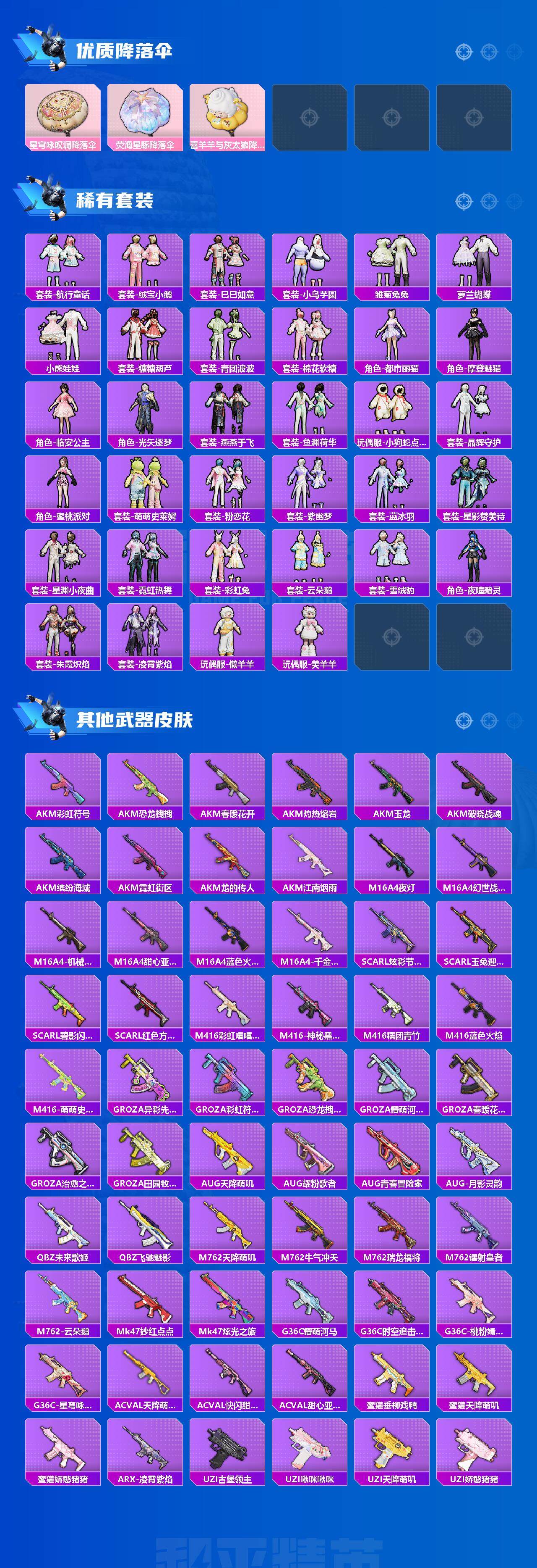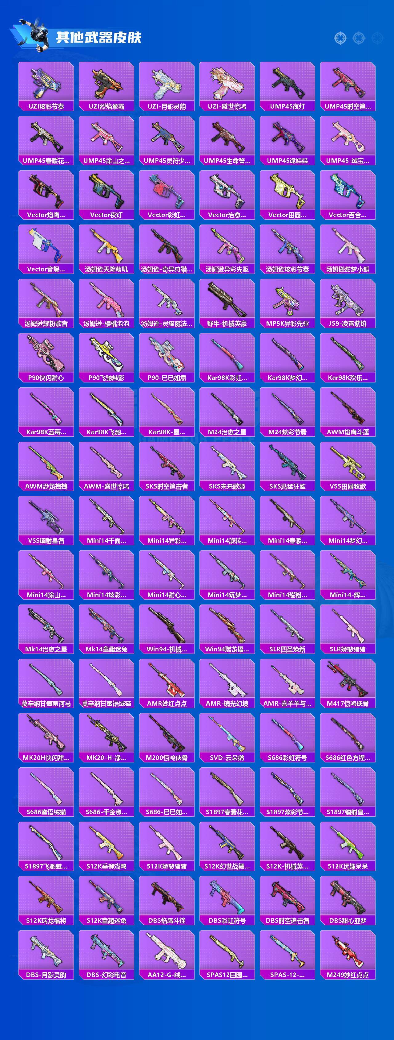 【粉色枪皮】:AKM-绿萝繁花,SCAR-L-锦绣绵绵,M416-心之恋语,M416-电玩时刻,Kar98K-巳巳如意,SLR-暗夜玫瑰,SPAS-12-蜜语绒猫,DP-28-千金淑猫,DP-28-豹影疾电,PKM-江南烟雨,破片手榴弹-瓶中星球,破片手榴弹-美味星星糖