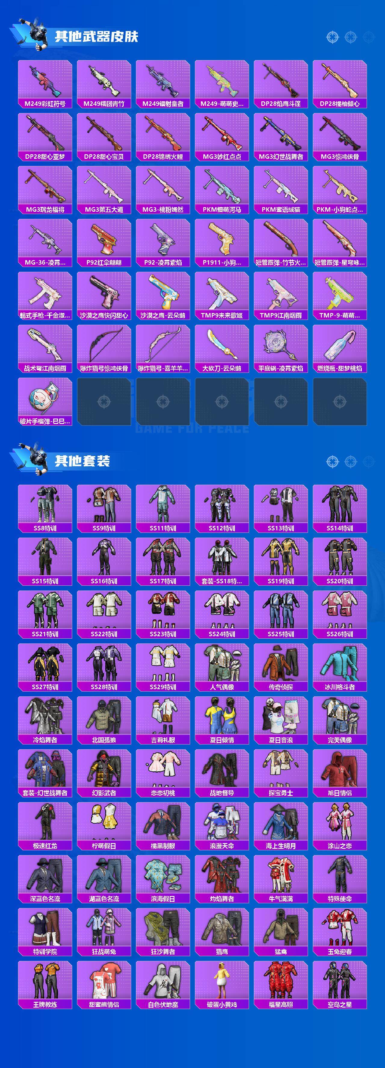 AKM-绿萝繁花,M416-心之恋语,M416-电玩时刻,Kar98K-巳巳如意,SLR-暗夜玫瑰,SPAS-12-蜜语绒猫,DP-28-千金淑猫,PKM-江南烟雨