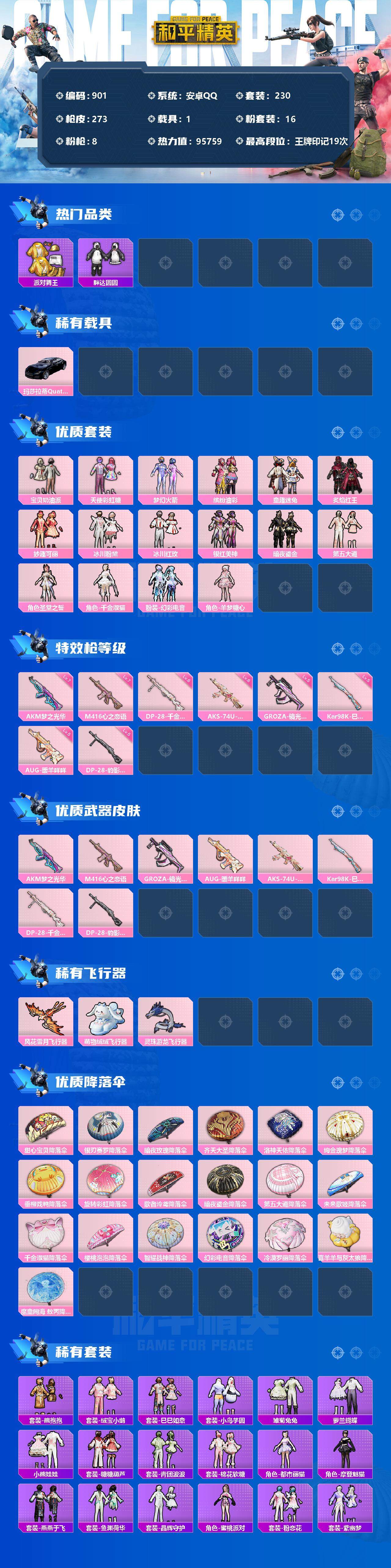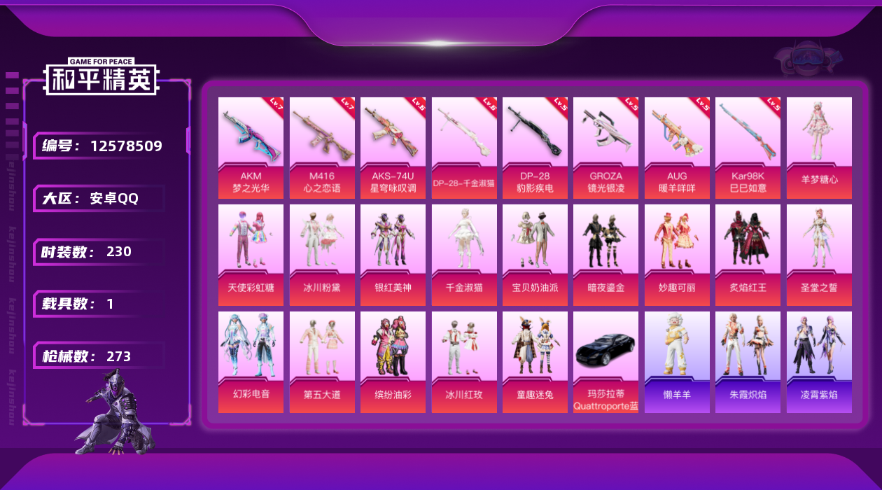 [12578509]安卓 手Q-16粉装-8特效枪-1载具-3粉色飞行器-95759热力值-19王牌印记-230套装-273枪皮 【热门品类】:粉装-梦幻火箭,粉装-童趣迷兔,粉装-缤纷油彩,套装-浪漫天命,套装-派对舞王,套装-胖达圆圆,角色-2B战斗服款,套装-龟仙人,套装-浪漫波比,套装-粉红小猪 【粉色载具】:玛莎拉蒂Quattroporte(夜幕蓝) 【粉色套装】:粉装-宝贝奶油派,粉装-天使彩虹糖,粉装-梦幻火箭,粉装-缤纷油彩,粉装-童趣迷兔,粉装-炙焰红王,粉装-妙趣可丽,粉装-冰川粉黛,粉装-冰川红玫,粉装-银红美神,粉装-暗夜鎏金,粉装-第五大道,角色-圣堂之誓,角色-千金淑猫,粉装-幻彩电音,角色-羊梦糖心 【粉色枪皮等级】:AKM-梦之光华(七级),M416-心之恋语(七级),GROZA-镜光银凌(五级),AUG-暖羊咩咩(五级),AKS-74U-星穹咏叹调(六级),Kar98K-巳巳如意(五级),DP-28-千金淑猫(六级),DP-28-豹影疾电(五级) 【粉色枪皮】:AKM-梦之光华,M416-心之恋语,GROZA-镜光银凌,AUG-暖羊咩咩,AKS-74U-星穹咏叹调,Kar98K-巳巳如意,DP-28-千金淑猫,DP-28-豹影疾电 【粉色飞行器】:风花雪月飞行器,萌物绒绒飞行器,灵珠游龙飞行器 【粉色降落伞】:甜心宝贝降落伞,银刃赛罗降落伞,暗夜玫瑰降落伞,齐天大圣降落伞,洛神天依降落伞,绚金瑰梦降落伞,垂柳戏鸭降落伞,旋转彩虹降落伞,歌者泠鸢降落伞,暗夜鎏金降落伞,第五大道降落伞,未来歌姬降落伞,千金淑猫降落伞,樱桃泡泡降落伞,智耀战神降落伞,幻彩电音降落伞,冷漠罗丽降落伞,喜羊羊与灰太狼降落伞,魔童闹海 敖丙降落伞 【稀有套装】:套装-龟仙人,套装-熊抱抱,套装-绒宝小鹅,套装-巳巳如意,套装-小鸟芋圆,套装-雏菊兔兔,套装-萝兰蝴蝶,套装-小熊娃娃,套装-糖糖葫芦,套装-青团波波,套装-棉花软糖,角色-都市丽猫,角色-摩登魅猫,套装-燕燕于飞,套装-鱼渊荷华,套装-晶辉守护,角色-蜜桃派对,套装-粉恋花,套装-紫幽梦,套装-蓝冰羽,角色-猎影月神,套装-霓虹热舞,套装-极速光影,套装-彩虹兔,套装-云朵鹅,套装-雪绒豹,角色-时希公主,套装-蜜露汐语,套装-朱霞炽焰,套装-凌霄紫焰,套装-擎苍青焰,玩偶服-懒羊羊 【稀有枪皮】:AKM-夜灯,A