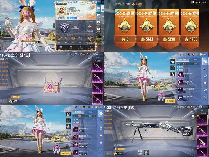 【粉色枪皮等级】:AKM-梦之光华(七级),M416-心之恋语(七级),GROZA-镜光银凌(五级),AUG-暖羊咩咩(五级),AKS-74U-星穹咏叹调(六级),Kar98K-巳巳如意(五级),DP-28-千金淑猫(六级),DP-28-豹影疾电(五级)