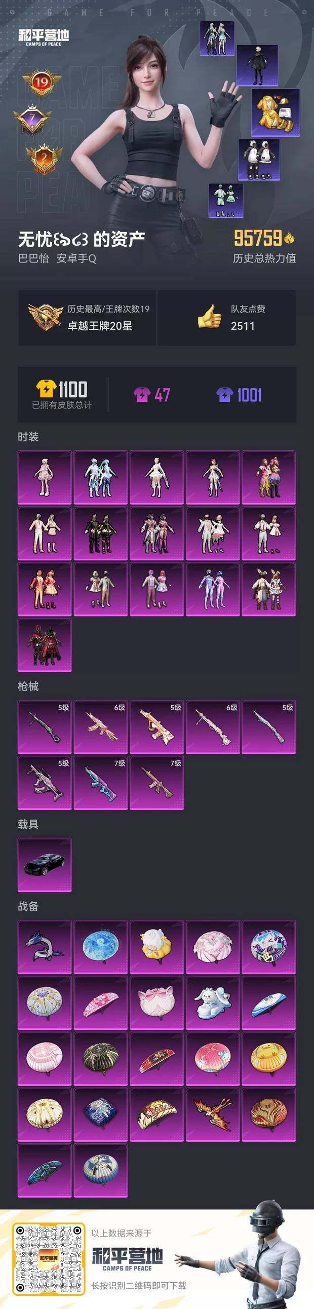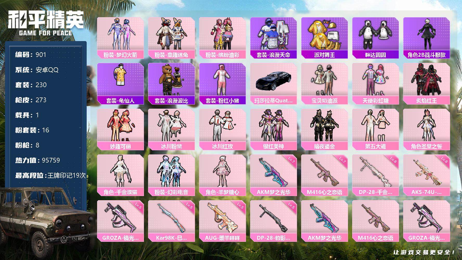 [12578509]安卓 手Q-16粉装-8特效枪-1载具-3粉色飞行器-95759热力值-19王牌印记-230套装-273枪皮
