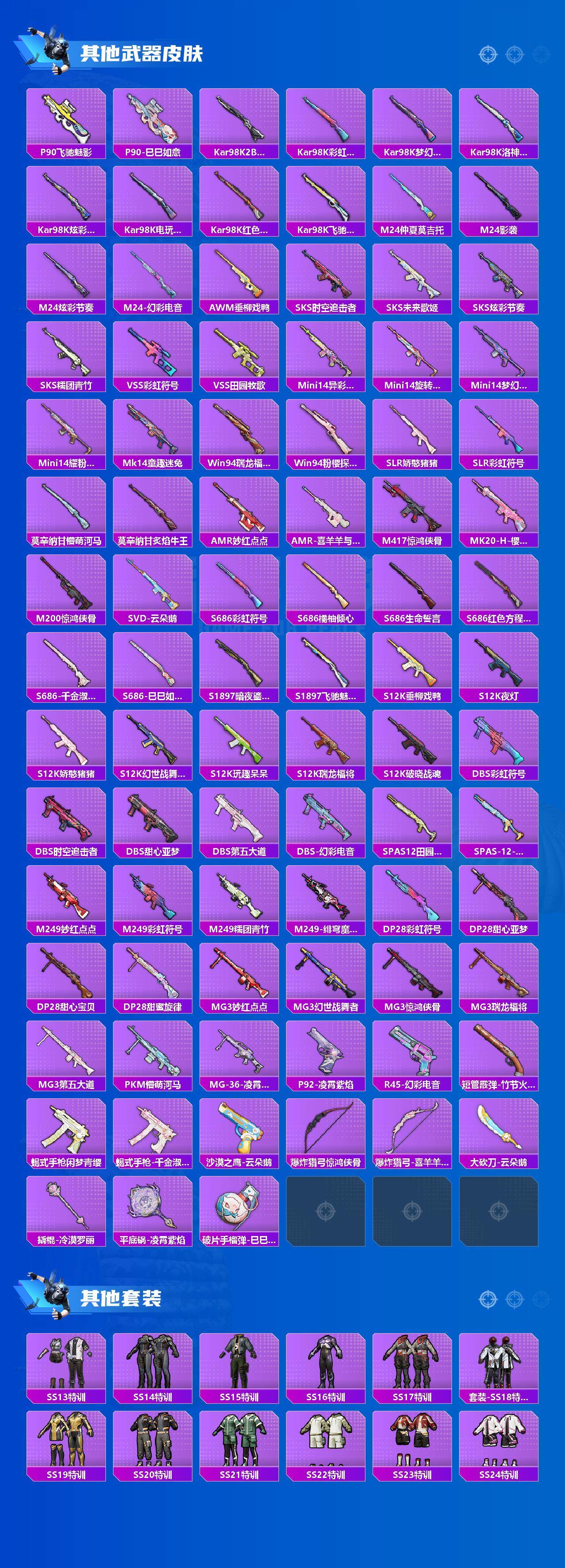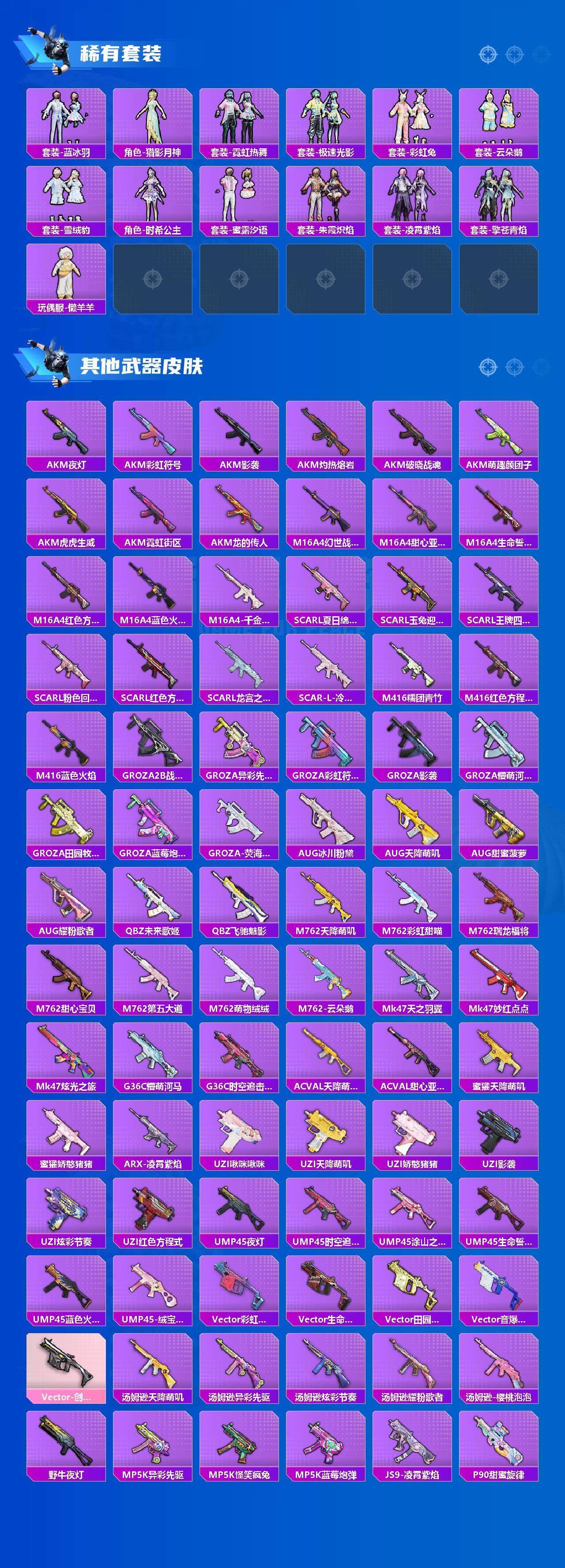 【粉色枪皮】:AKM-梦之光华,M416-心之恋语,GROZA-镜光银凌,AUG-暖羊咩咩,AKS-74U-星穹咏叹调,Kar98K-巳巳如意,DP-28-千金淑猫,DP-28-豹影疾电