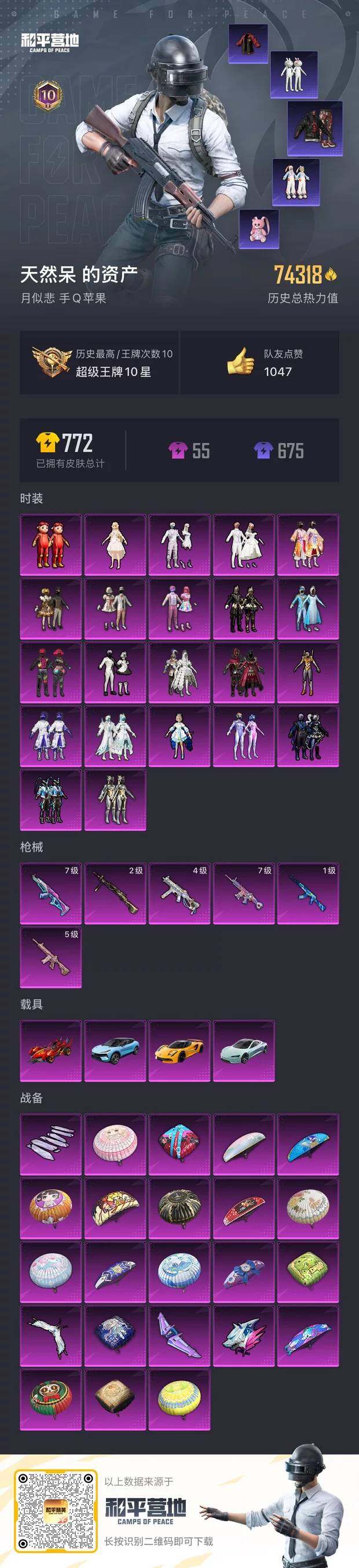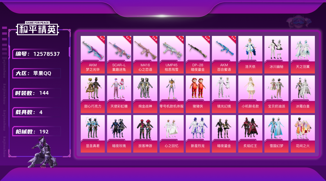 [12578537]苹果 手Q-22粉装-6特效枪-4载具-4粉色飞行器-74319热力值-10王牌印记-144套装-192枪皮