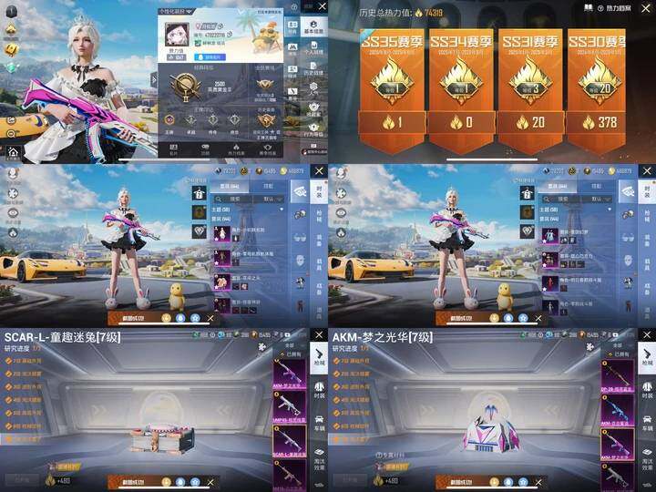 【粉色枪皮等级】:AKM-梦之光华(七级),AKM-百合蜜语(一级),SCAR-L-童趣迷兔(七级),M416-心之恋语(五级),UMP45-相思残雪(四级),DP-28-暗夜鎏金(二级)