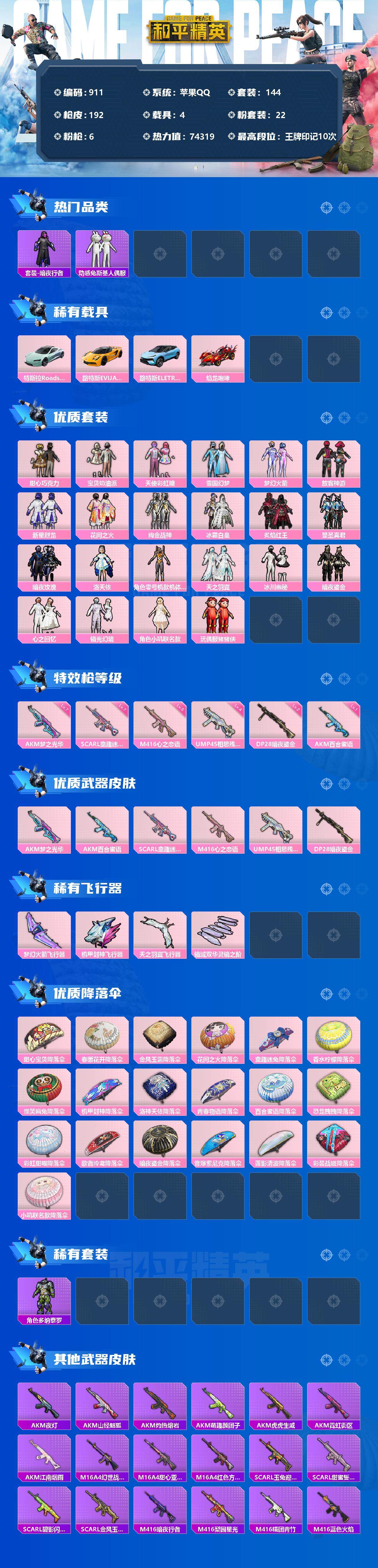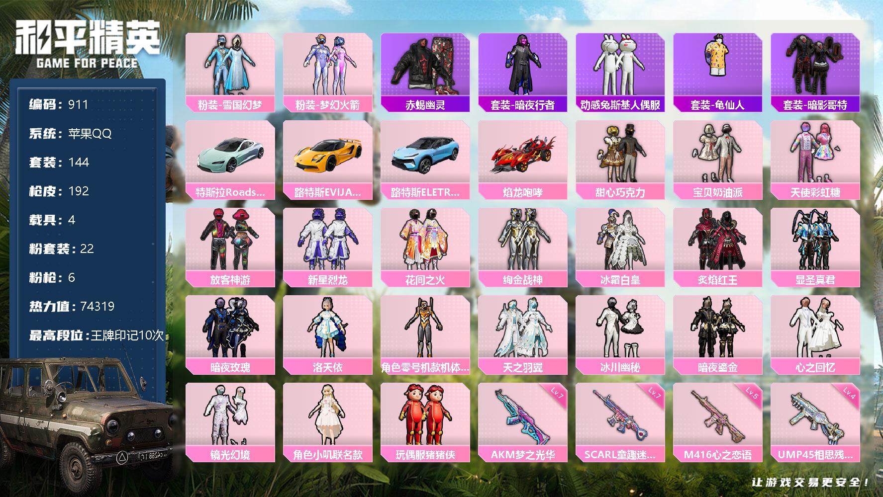 [12578537]苹果 手Q-22粉装-6特效枪-4载具-4粉色飞行器-74319热力值-10王牌印记-144套装-192枪皮 【热门品类】:粉装-雪国幻梦,粉装-梦幻火箭,套装-赤蝎幽灵,套装-暗夜行者,套装-动感兔斯基人偶服,套装-龟仙人,套装-暗影哥特 【粉色载具】:特斯拉Roadster(水滴蓝),路特斯EVIJA(星际黄),路特斯ELETRE(冰川蓝),焰龙咆哮 【粉色套装】:粉装-甜心巧克力,粉装-宝贝奶油派,粉装-天使彩虹糖,粉装-雪国幻梦,粉装-梦幻火箭,粉装-放客神游,粉装-新星烈龙,粉装-花间之火,粉装-绚金战神,粉装-冰霜白皇,粉装-炙焰红王,粉装-显圣真君,粉装-暗夜玫瑰,角色-洛天依,角色-零号机款机体服,粉装-天之羽翼,粉装-冰川幽秘,粉装-暗夜鎏金,粉装-心之回忆,粉装-镜光幻境,角色-小叽联名款,玩偶服-猪猪侠 【粉色枪皮等级】:AKM-梦之光华(七级),AKM-百合蜜语(一级),SCAR-L-童趣迷兔(七级),M416-心之恋语(五级),UMP45-相思残雪(四级),DP-28-暗夜鎏金(二级) 【粉色枪皮】:AKM-梦之光华,AKM-百合蜜语,SCAR-L-童趣迷兔,M416-心之恋语,UMP45-相思残雪,DP-28-暗夜鎏金 【粉色飞行器】:梦幻火箭飞行器,机甲封神飞行器,天之羽翼飞行器,镜域双华-灵镜之阶 【粉色降落伞】:甜心宝贝降落伞,春暖花开降落伞,金风玉露降落伞,花间之火降落伞,童趣迷兔降落伞,香水柠檬降落伞,怪笑疯兔降落伞,机甲封神降落伞,洛神天依降落伞,青春物语降落伞,百合蜜语降落伞,恐龙拽拽降落伞,彩虹甜喵降落伞,歌者泠鸢降落伞,暗夜鎏金降落伞,音爆索尼克降落伞,莲影清波降落伞,彩装战姬降落伞,小叽联名款降落伞 【稀有套装】:套装-龟仙人,角色-多纳泰罗 【稀有枪皮】:AKM-夜灯,AKM-山经魅狐,AKM-江南烟雨,AKM-灼热熔岩,AKM-萌趣颜团子,AKM-虎虎生威,AKM-霓虹街区,M16A4-幻世战舞者,M16A4-甜心亚梦,M16A4-红色方程式,SCAR-L-玉兔迎春,SCAR-L-甜蜜誓约,SCAR-L-碧影闪光,SCAR-L-金风玉露,M416-暗夜行者,M416-梨园星光,M416-糯团青竹,M416-蓝色火焰,GROZA-彩虹符号,GROZA-林间仙鹿,GROZA-治愈之星,GROZA-田园牧歌,AUG-青