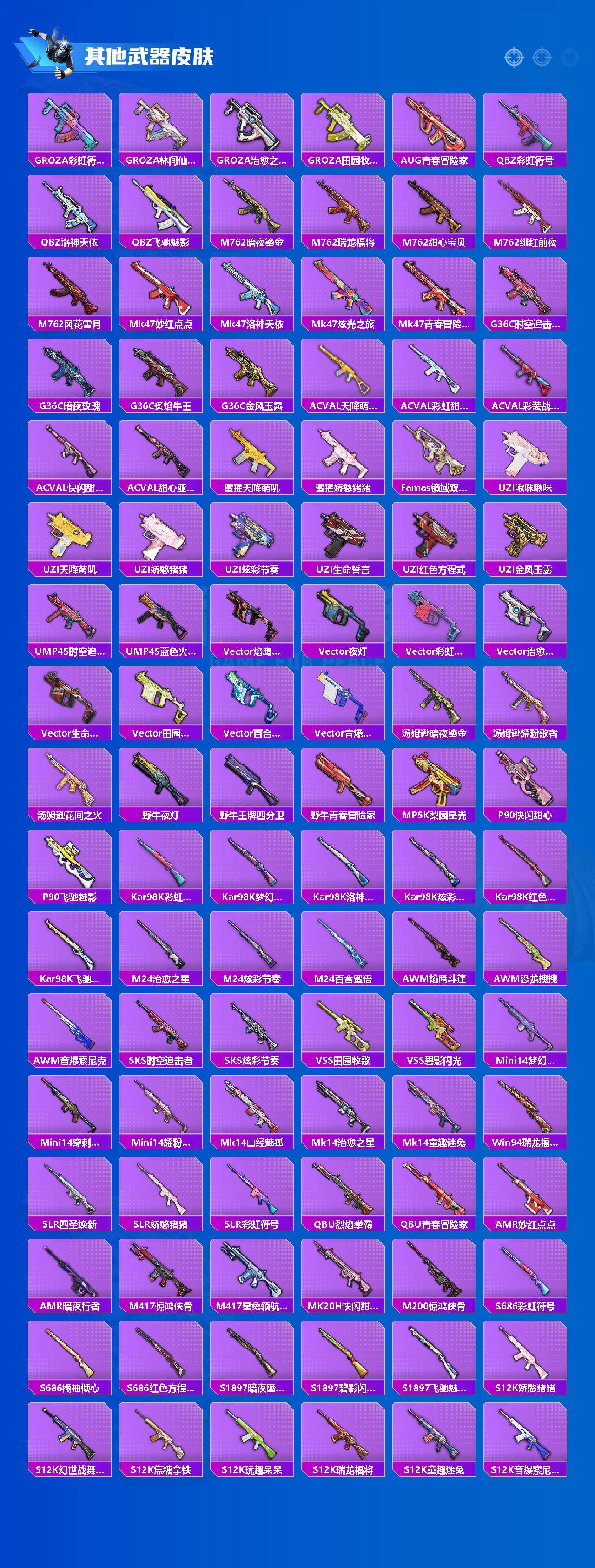 【稀有枪皮】:AKM-夜灯,AKM-山经魅狐,AKM-江南烟雨,AKM-灼热熔岩,AKM-萌趣颜团子,AKM-虎虎生威,AKM-霓虹街区,M16A4-幻世战舞者,M16A4-甜心亚梦,M16A4-红色方程式,SCAR-L-玉兔迎春,SCAR-L-甜蜜誓约,SCAR-L-碧影闪光,SCAR-L-金风玉露,M416-暗夜行者,M416-梨园星光,M416-糯团青竹,M416-蓝色火焰,GROZA-彩虹符号,GROZA-林间仙鹿,GROZA-治愈之星,GROZA-田园牧歌,AUG-青