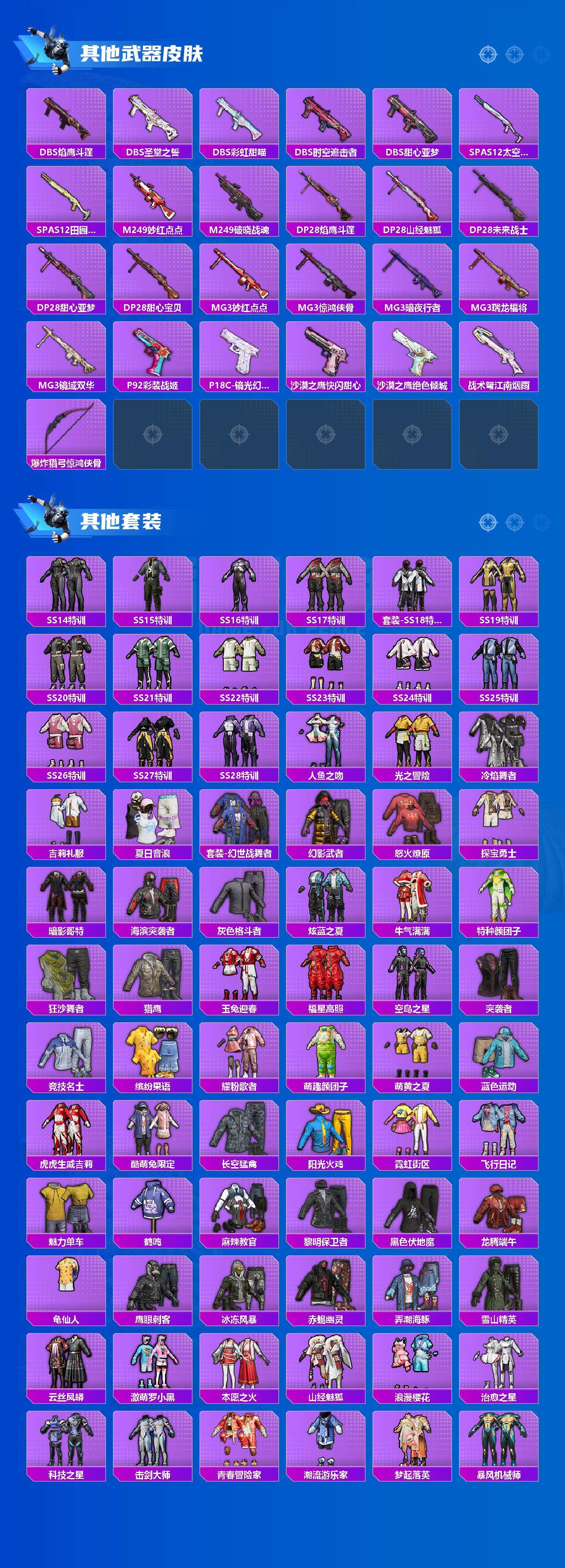 角色-洛天依,套装-冰川幽秘,套装-天之羽翼,套装-天使彩虹糖,套装-绚金战神,角色-零号机款机体服,玩偶服-猪猪侠,套装-镜光幻境,角色-小叽联名款,套装-宝贝奶油派,套装-显圣真君,套装-暗夜玫瑰,套装-放客神游,套装-心之回忆,套装-新星烈龙,套装-暗夜鎏金,套装-炙焰红王,套装-雪国幻梦,套装-花间之火