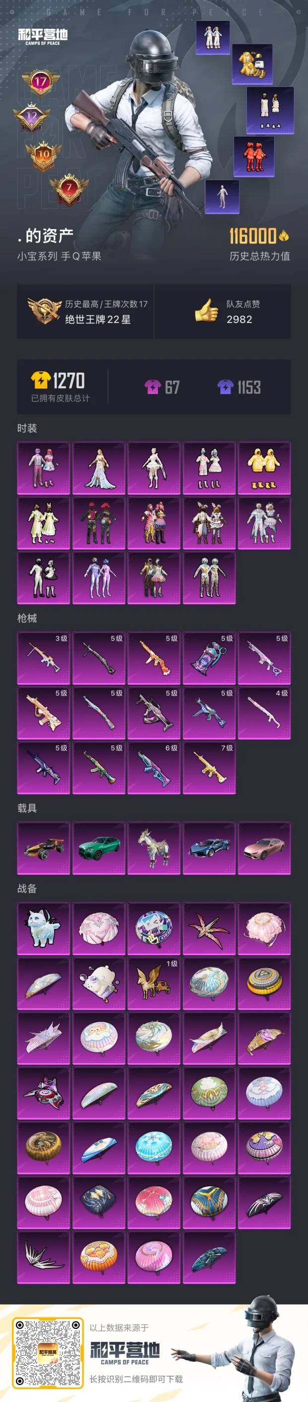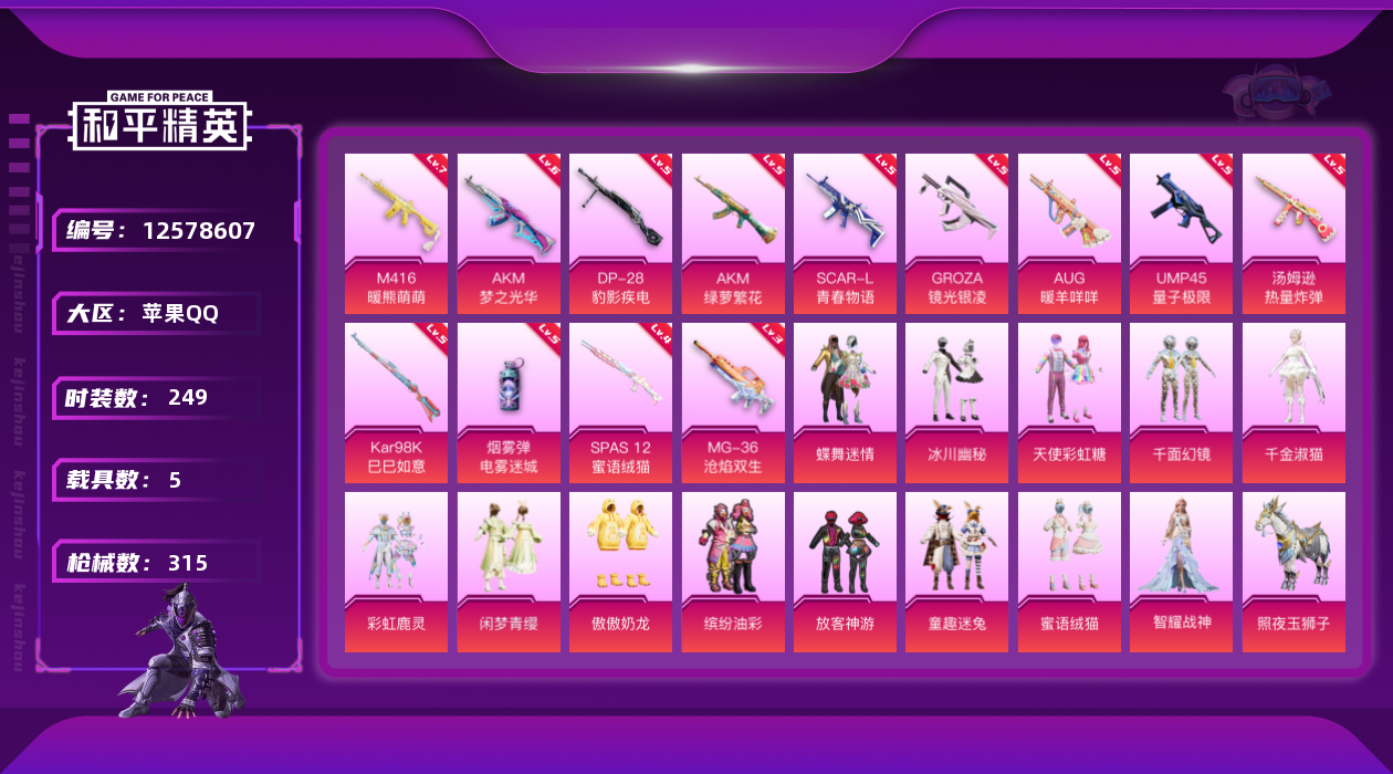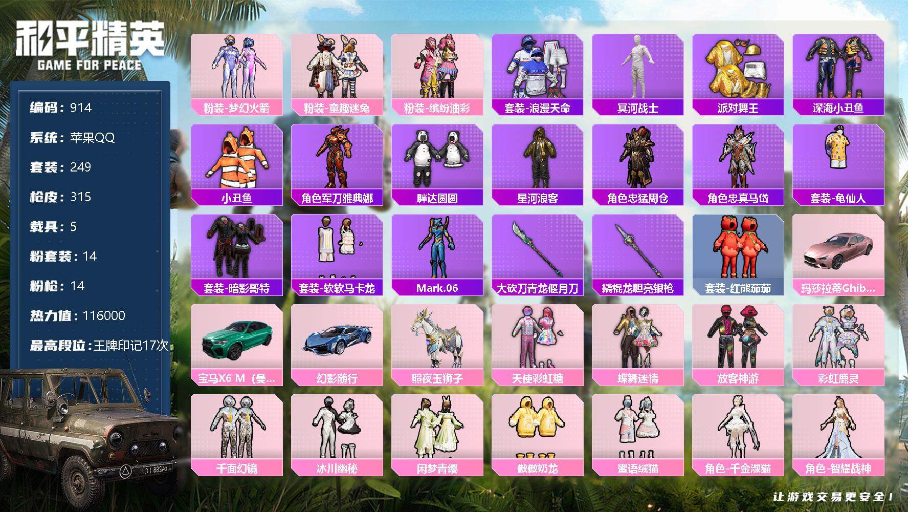 [12578607]苹果 手Q-14粉装-14特效枪-5载具-6粉色飞行器-116000热力值-17王牌印记-249套装-315枪皮