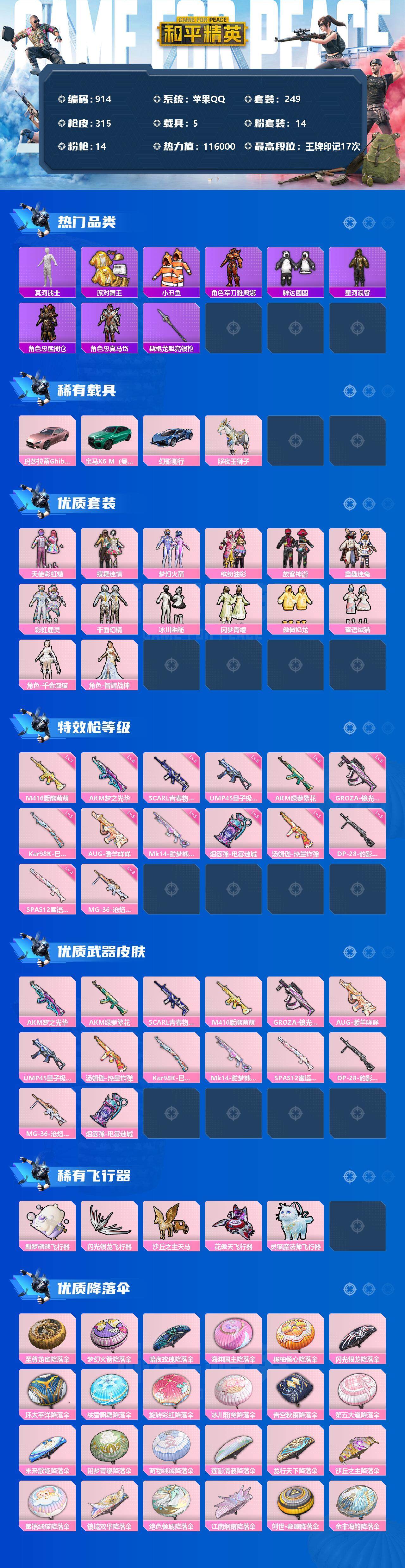 [12578607]苹果 手Q-14粉装-14特效枪-5载具-6粉色飞行器-116000热力值-17王牌印记-249套装-315枪皮 【热门品类】:粉装-梦幻火箭,粉装-童趣迷兔,粉装-缤纷油彩,套装-浪漫天命,套装-冥河战士,套装-派对舞王,套装-深海小丑鱼,套装-小丑鱼,角色-军刀雅典娜,套装-胖达圆圆,套装-星河浪客,角色-忠猛周仓,角色-忠真马岱,套装-龟仙人,套装-暗影哥特,套装-软软马卡龙,角色-Mark.06,大砍刀-青龙偃月刀,撬棍-龙胆亮银枪,套装-红熊茄茄 【粉色载具】:玛莎拉蒂Ghibli(粉),宝马X6 M(曼岛绿),幻影随行,照夜玉狮子 【粉色套装】:粉装-天使彩虹糖,粉装-蝶舞迷情,粉装-梦幻火箭,粉装-缤纷油彩,粉装-放客神游,粉装-童趣迷兔,粉装-彩虹鹿灵,粉装-千面幻镜,粉装-冰川幽秘,粉装-闲梦青缨,粉装-傲傲奶龙,粉装-蜜语绒猫,角色-千金淑猫,角色-智耀战神 【粉色枪皮等级】:AKM-梦之光华(六级),AKM-绿萝繁花(五级),SCAR-L-青春物语(五级),M416-暖熊萌萌(七级),GROZA-镜光银凌(五级),AUG-暖羊咩咩(五级),UMP45-量子极限(五级),汤姆逊-热量炸弹(五级),Kar98K-巳巳如意(五级),Mk14-甜梦熊击(五级),SPAS-12-蜜语绒猫(四级),DP-28-豹影疾电(五级),MG-36-沧焰双生(三级),烟雾弹-电雾迷城(五级) 【粉色枪皮】:AKM-梦之光华,AKM-绿萝繁花,SCAR-L-青春物语,M416-暖熊萌萌,GROZA-镜光银凌,AUG-暖羊咩咩,UMP45-量子极限,汤姆逊-热量炸弹,Kar98K-巳巳如意,Mk14-甜梦熊击,SPAS-12-蜜语绒猫,DP-28-豹影疾电,MG-36-沧焰双生,烟雾弹-电雾迷城 【粉色飞行器】:酣梦熊熊飞行器,闪光银龙飞行器,沙丘之主天马,花傲天飞行器,灵猫魔法师飞行器 【粉色降落伞】:至尊龙雀降落伞,梦幻火箭降落伞,暗夜玫瑰降落伞,海渊国主降落伞,橘柚倾心降落伞,闪光银龙降落伞,环太平洋降落伞,绒雪飘舞降落伞,旋转彩虹降落伞,冰川粉黛降落伞,青空秋雨降落伞,第五大道降落伞,未来歌姬降落伞,闲梦青缨降落伞,萌物绒绒降落伞,莲影清波降落伞,龙行天下降落伞,沙丘之主降落伞,蜜语绒猫降落伞,镜域双华降落伞,绝色倾城降落伞,江南烟雨降落伞,创世·救赎降落伞,