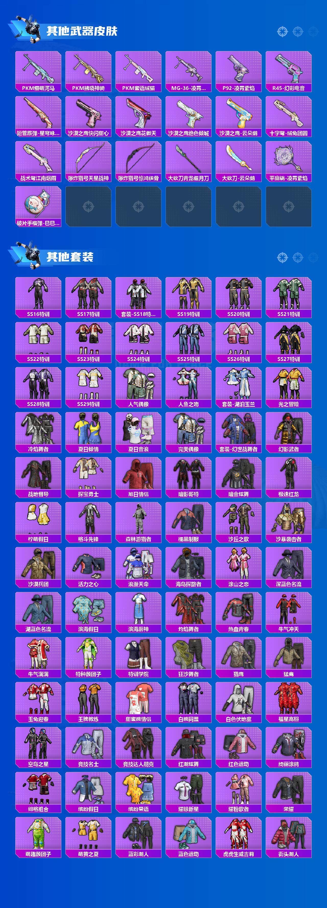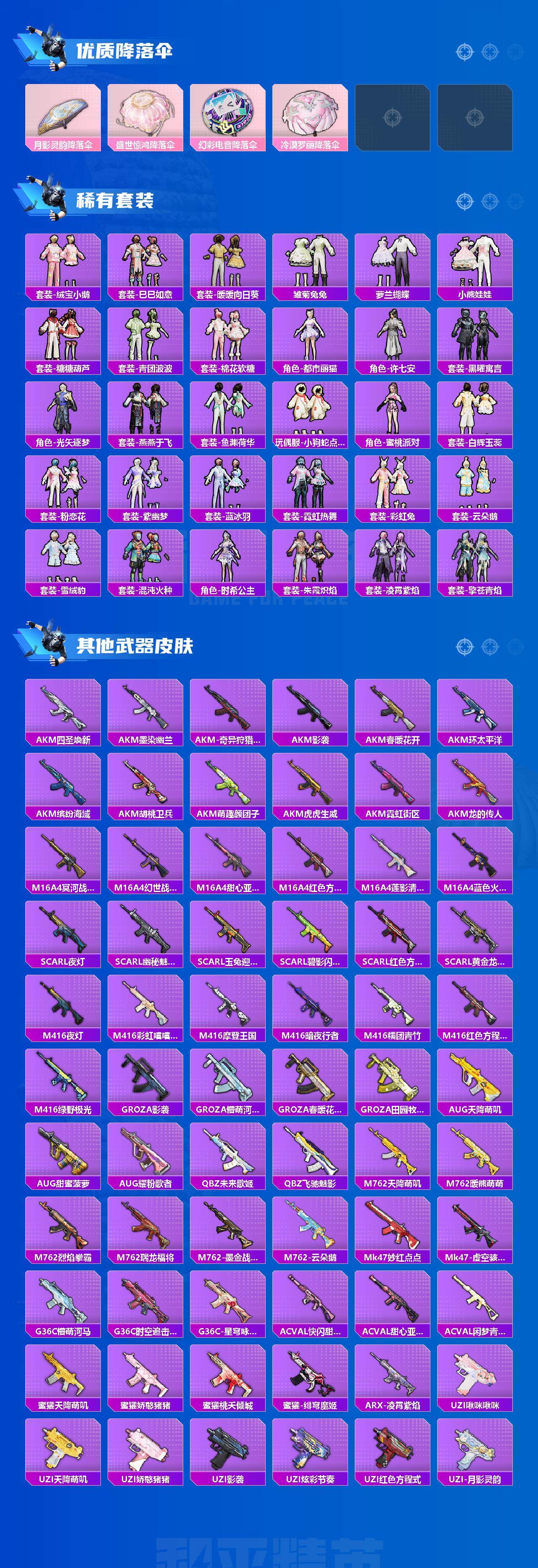 - [12582017]苹果 手Q-15粉装-5特效枪-3载具-4粉色飞行器-76139热力值-15王牌印记-137套装-211枪皮 【热门品类】:粉装-缤纷油彩,套装-龟仙人,套装-暗影哥特 【粉色载具】:兰博基尼Aventador SVJ(翡翠绿),兰博基尼Estoque(银翼灰),焰龙咆哮 【粉色套装】:粉装-缤纷油彩,粉装-彩虹鹿灵,粉装-山涧鹿灵,角色-洛天依,粉装-碧影闪光,粉装-岚岚物语,粉装-甜梦小狐,粉装-暗夜鎏金,粉装-心之回忆,角色-白勺歌姬,角色-呆萌星弥,角色-小可学妹,粉装-未来歌姬,粉装-天衡星秤,粉装-暖暖奶龙 【粉色枪皮等级】:AKM-星际浪客(七级),SCAR-L-纯梦嫁纱(七级),Kar98K-巳巳如意(三级),M24-翩跹演武(七级),MG3-梦幻舞会(七级) 【粉色枪皮】:AKM-星际浪客,SCAR-L-纯梦嫁纱,Kar98K-巳巳如意,M24-翩跹演武,MG3-梦幻舞会 【粉色飞行器】:齐天大圣飞行器,天之羽翼飞行器,太空嘟嘟飞行器,凤舞九天飞行器 【粉色降落伞】:暗夜玫瑰降落伞,林间仙鹿降落伞,洛神天依降落伞,天之羽翼降落伞,焦糖拿铁降落伞,碧影闪光降落伞,恐龙拽拽降落伞,橘柚倾心降落伞,筑梦精灵降落伞,甜梦小狐降落伞,妙趣可丽降落伞,彩虹甜喵降落伞,暗夜鎏金降落伞,白勺歌姬降落伞,闲梦青缨降落伞,萌物绒绒降落伞,精灵梦叶罗丽降落伞,金丰海韵降落伞,未来领航者降落伞,盛世惊鸿降落伞 【稀有套装】:套装-龟仙人,角色-多纳泰罗 【稀有枪皮】:AKM-夜灯,AKM-彩虹符号,AKM-影袭,AKM-星之彼岸,AKM-星兔领航员,AKM-生命誓言,AKM-百万伏特,AKM-破晓战魂,AKM-缤纷海域,AKM-萌趣颜团子,AKM-虎虎生威,AKM-霓虹街区,AKM-龙的传人,M16A4-幻世战舞者,M16A4-甜心亚梦,M16A4-红色方程式,M16A4-蓝色火焰,SCAR-L-暗夜玫瑰,SCAR-L-炫彩节奏,SCAR-L-玉兔迎春,SCAR-L-红色方程式,SCAR-L-银碳小老虎,M416-神秘黑猫,M416-糯团青竹,M416-紫翼圣骑,M416-红色方程式,M416-绯红前夜,GROZA-异彩先驱,GROZA-彩虹符号,GROZA-懵萌河马,GROZA-林间仙鹿,GROZA-田园牧歌,AUG-天降萌叽,AUG-耀粉歌者,QBZ-彩虹符号,QB