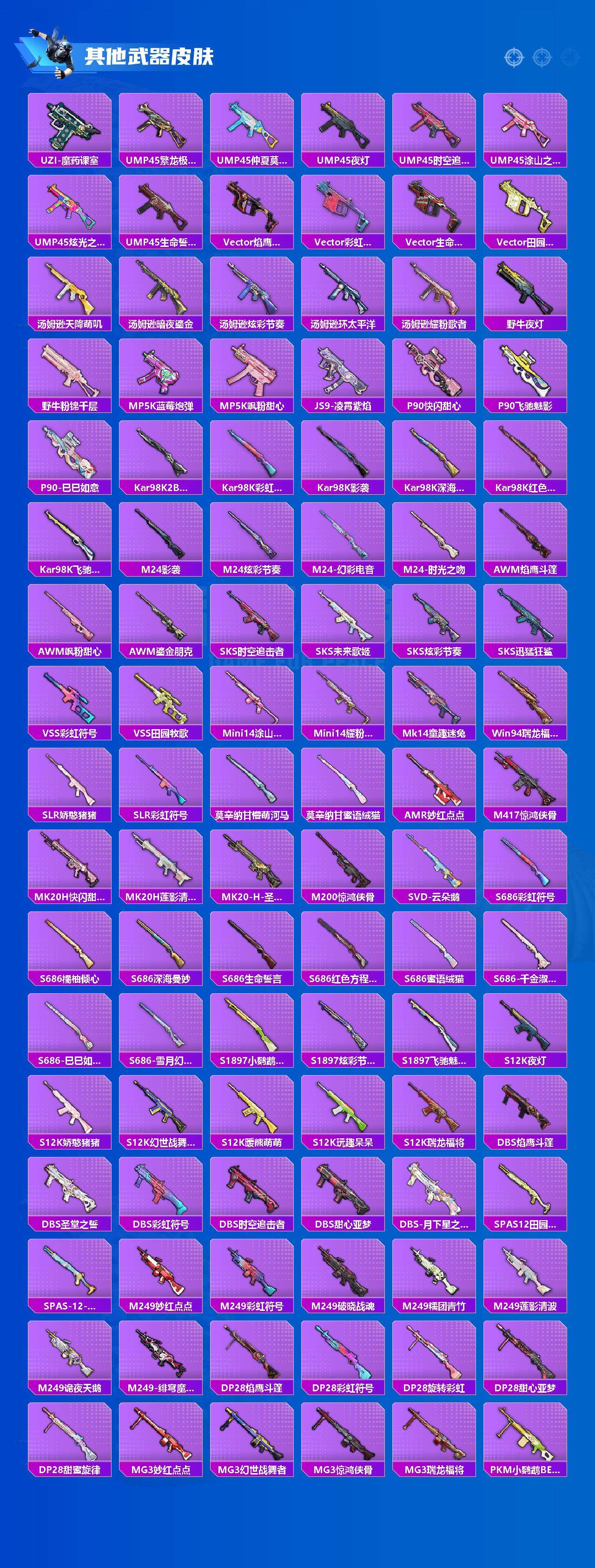 【粉色枪皮】:AKM-梦之光华,AKM-绿萝繁花,SCAR-L-青春物语,M416-暖熊萌萌,GROZA-镜光银凌,AUG-暖羊咩咩,UMP45-量子极限,汤姆逊-热量炸弹,Kar98K-巳巳如意,Mk14-甜梦熊击,SPAS-12-蜜语绒猫,DP-28-豹影疾电,MG-36-沧焰双生,烟雾弹-电雾迷城