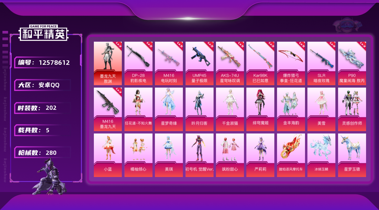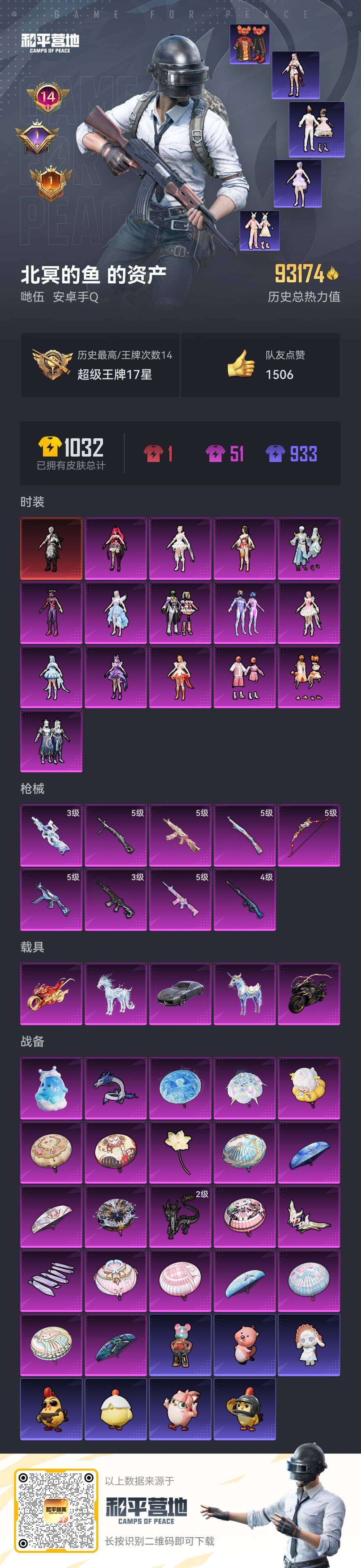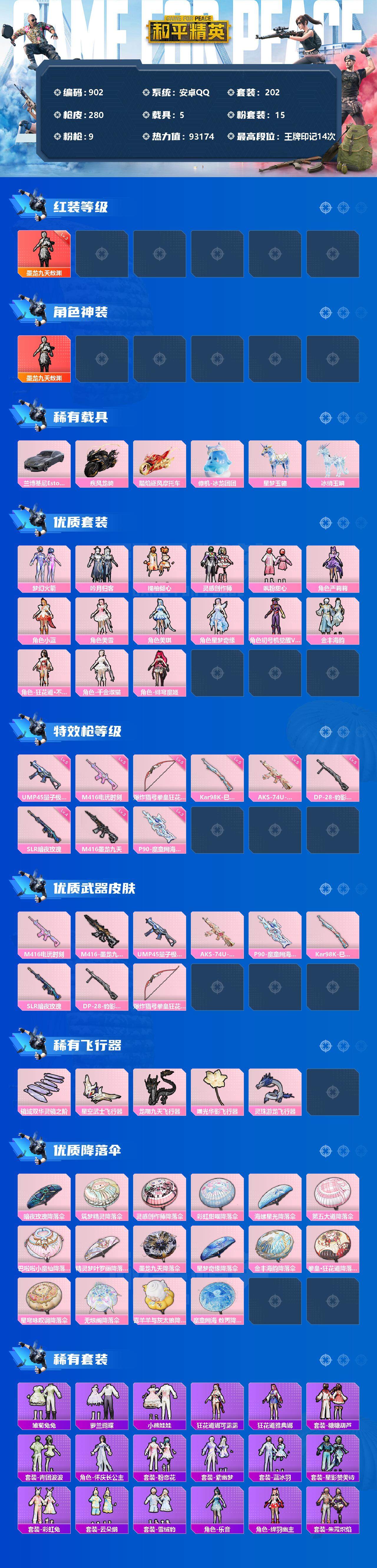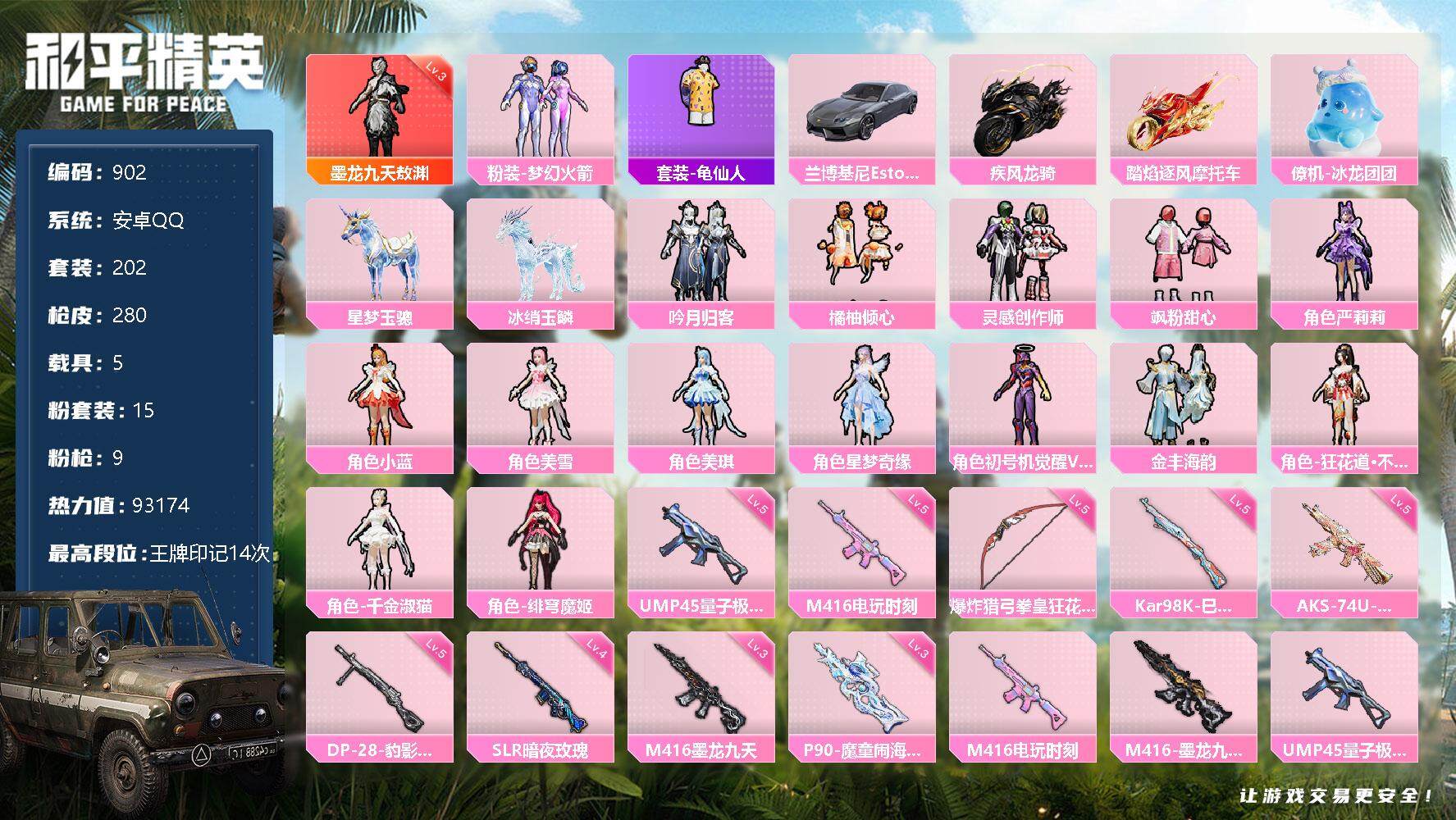 [12578612]安卓 手Q-1神装-15粉装-9特效枪-5载具-5粉色飞行器-93174热力值-14王牌印记-202套装-280枪皮