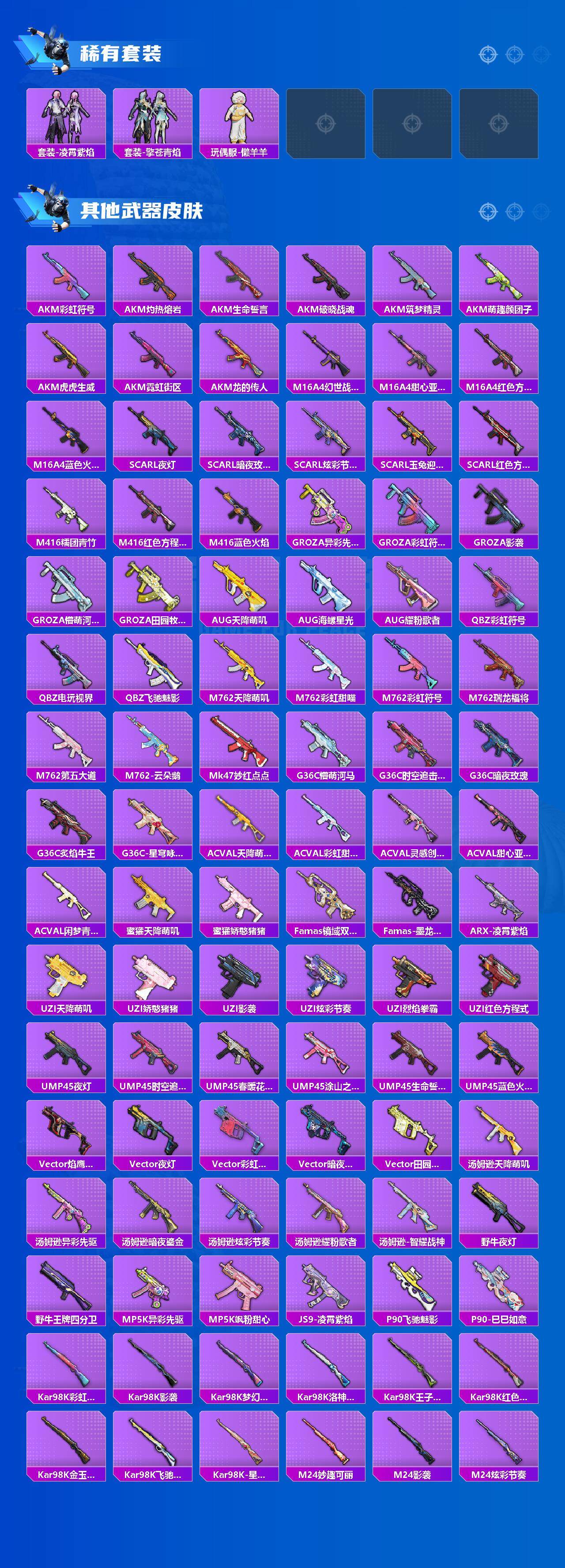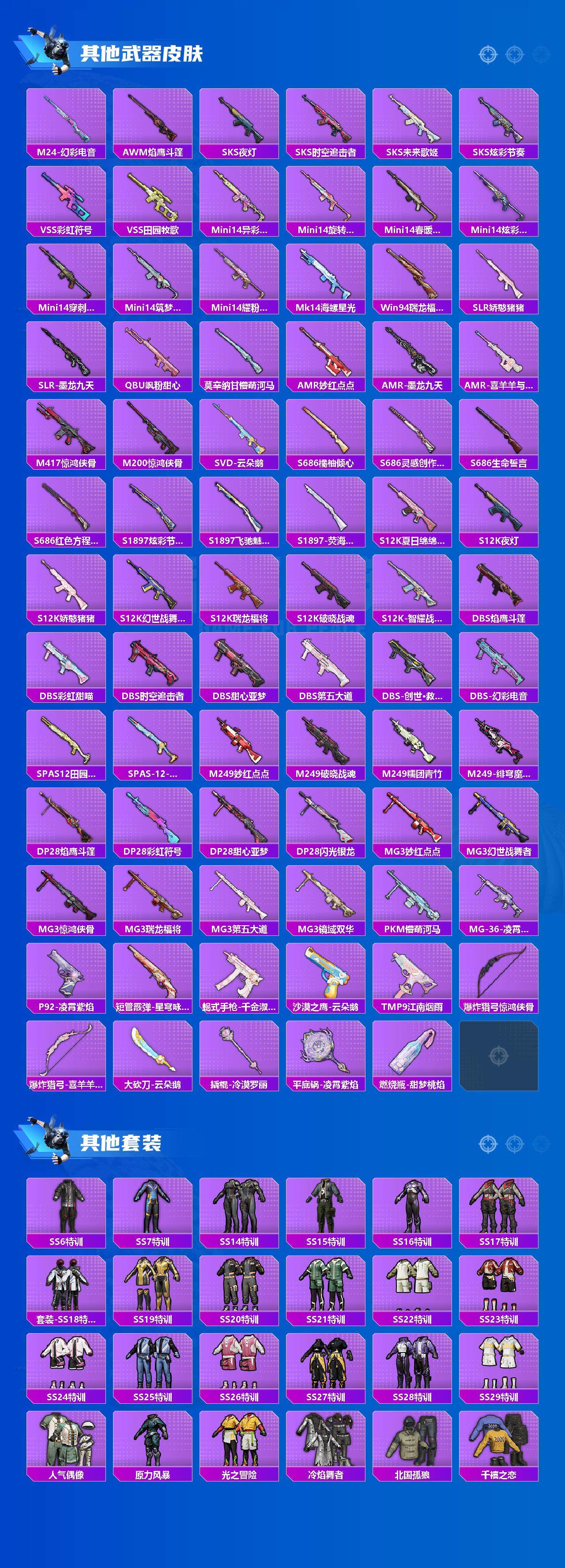 - PX_1938502-实名: 可修改 时装数: 231 载具数: 4 枪械数: 105 战备数: 73 神级装扮: 镜域双华-欧若拉 热门装扮: 木曜青龙,相思残雪,小可学妹,白勺歌姬,闲梦青缨,圣堂之誓,创世·救赎,星梦奇缘,初号机 觉醒Ver.,狂花道·不知火舞 载具: 路特斯ELETRE(冰川蓝),宾利飞驰(布罗德盖棕双色),疾风龙骑,星梦玉骢 稀有枪皮: MG3梦幻舞会,DP-28圣堂之誓