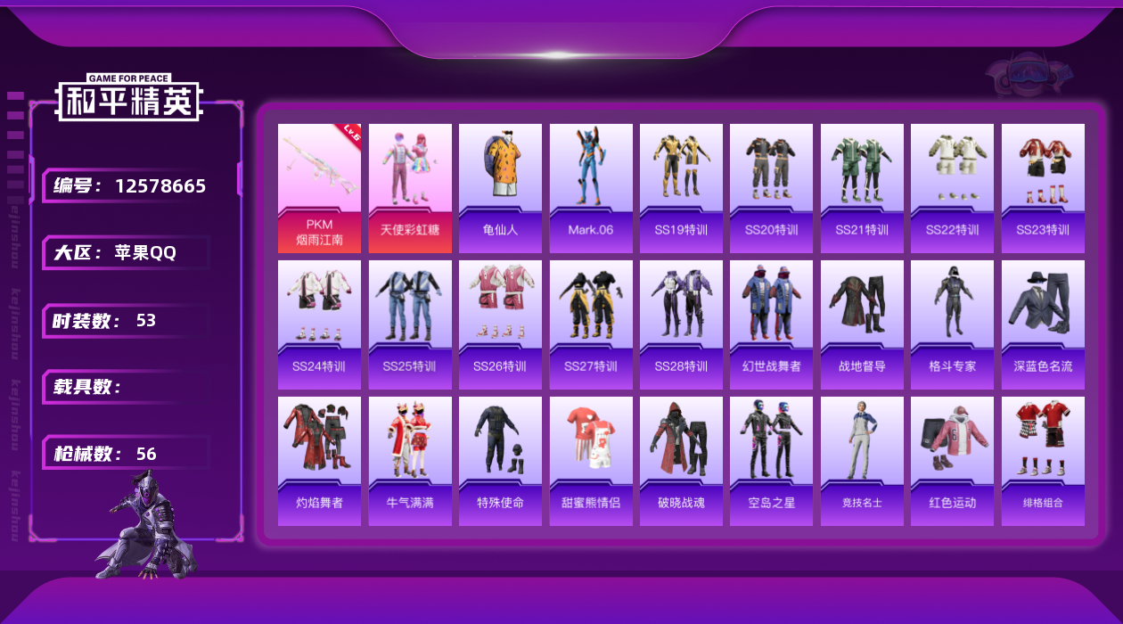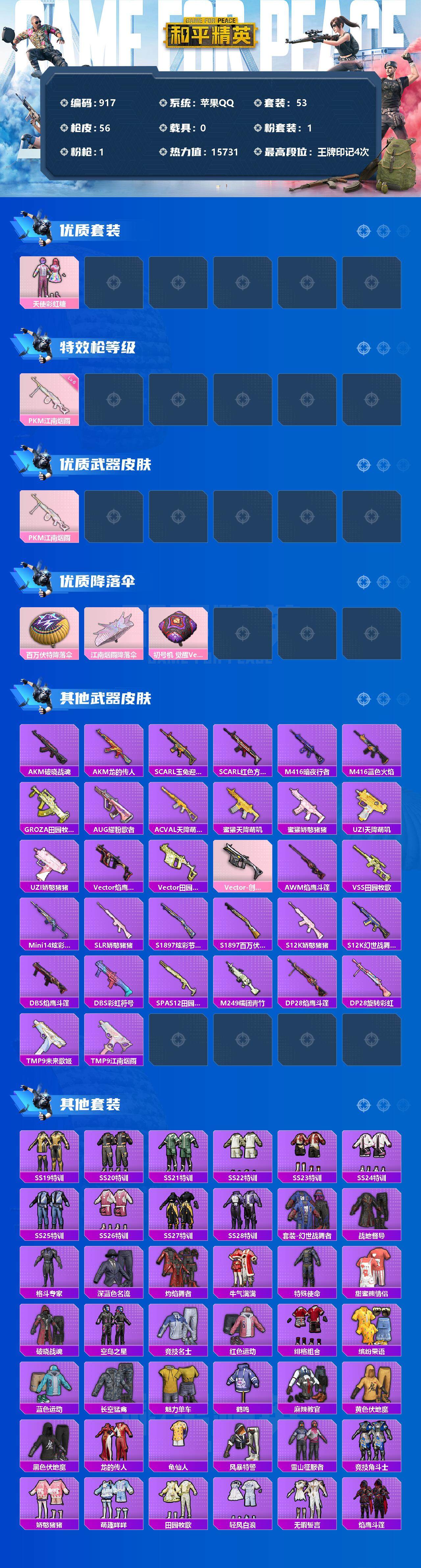 [12578665]苹果 手Q-1粉装-1特效枪-0载具-0粉色飞行器-15731热力值-4王牌印记-53套装-56枪皮 【热门品类】:套装-龟仙人,角色-Mark.06 【粉色套装】:粉装-天使彩虹糖 【粉色枪皮等级】:PKM-江南烟雨(六级) 【粉色枪皮】:PKM-江南烟雨 【粉色降落伞】:百万伏特降落伞,江南烟雨降落伞,初号机 觉醒Ver.降落伞 【稀有套装】:套装-龟仙人 【稀有枪皮】:AKM-破晓战魂,AKM-龙的传人,SCAR-L-玉兔迎春,SCAR-L-红色方程式,M416-暗夜行者,M416-蓝色火焰,GROZA-田园牧歌,AUG-耀粉歌者,AC-VAL-天降萌叽,蜜獾-天降萌叽,蜜獾-娇憨猪猪,UZI-天降萌叽,UZI-娇憨猪猪,Vector-焰鹰斗篷,Vector-田园牧歌,Vector-创世·救赎,AWM-焰鹰斗篷,VSS-田园牧歌,Mini14-炫彩节奏,SLR-娇憨猪猪,S1897-炫彩节奏,S1897-百万伏特,S12K-娇憨猪猪,S12K-幻世战舞者,DBS-焰鹰斗篷,DBS-彩虹符号,SPAS-12-田园牧歌,M249-糯团青竹,DP-28-焰鹰斗篷,DP-28-旋转彩虹,TMP-9-江南烟雨,TMP-9-未来歌姬 【其他套装】:套装-SS19特训,套装-SS20特训,套装-SS21特训,套装-SS22特训,套装-SS23特训,套装-SS24特训,套装-SS25特训,套装-SS26特训,套装-SS27特训,套装-SS28特训,套装-幻世战舞者,套装-战地督导,套装-格斗专家,套装-深蓝色名流,套装-灼焰舞者,套装-牛气满满,套装-特殊使命,套装-甜蜜熊情侣,套装-破晓战魂,套装-空岛之星,套装-竞技名士,套装-红色运动,套装-绯格组合,套装-缤纷果语,套装-蓝色运动,套装-长空猛禽,套装-魅力单车,套装-鹤鸣,套装-麻辣教官,套装-黄色伏地魔,套装-黑色伏地魔,套装-龙的传人,套装-龟仙人,套装-风暴特警,套装-雪山征服者,套装-竞技角斗士,套装-娇憨猪猪,套装-萌趣咩咩,套装-田园牧歌,套装-轻风白浪,套装-无暇誓言,套装-焰鹰斗篷,套装-幽夜迷踪,套装-幻羽潜行,角色-湖雨初晴,套装-纯真浪花,套装-热情海星,角色-Mark.06 【稀有头盔】:甜心宝贝头盔(2级) 【稀有背包】:甜心宝贝背包(1级) 【营地ID】:797598890