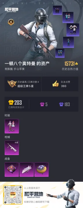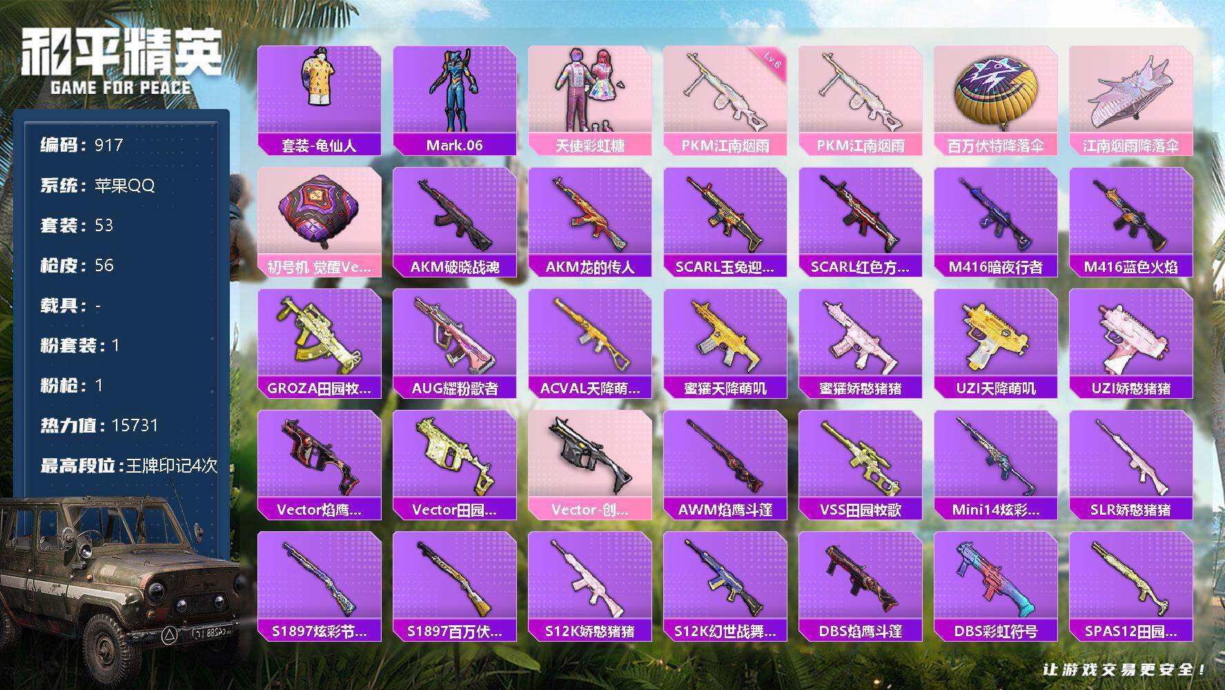 [12578665]苹果 手Q-1粉装-1特效枪-0载具-0粉色飞行器-15731热力值-4王牌印记-53套装-56枪皮