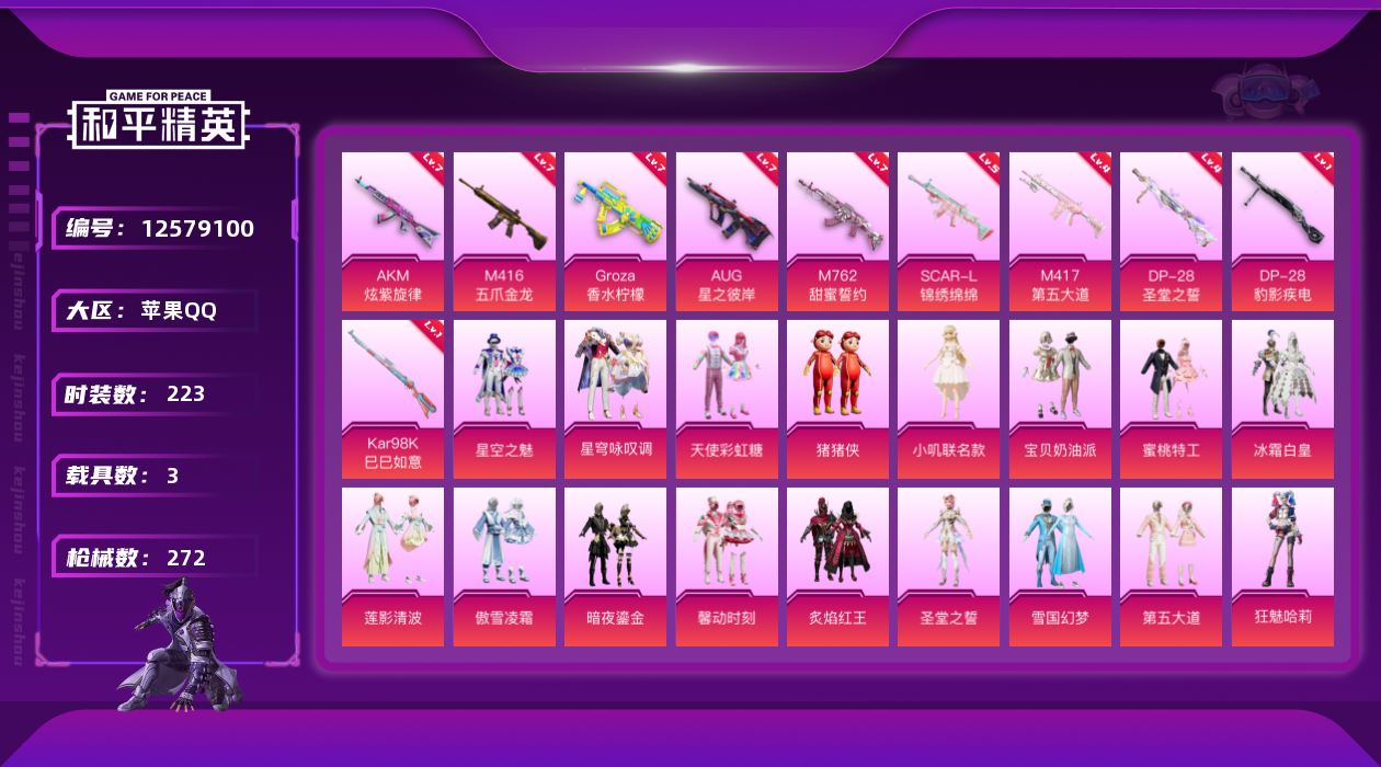 [12579100]苹果 手Q-29粉装-10特效枪-3载具-6粉色飞行器-111366热力值-21王牌印记-223套装-272枪皮