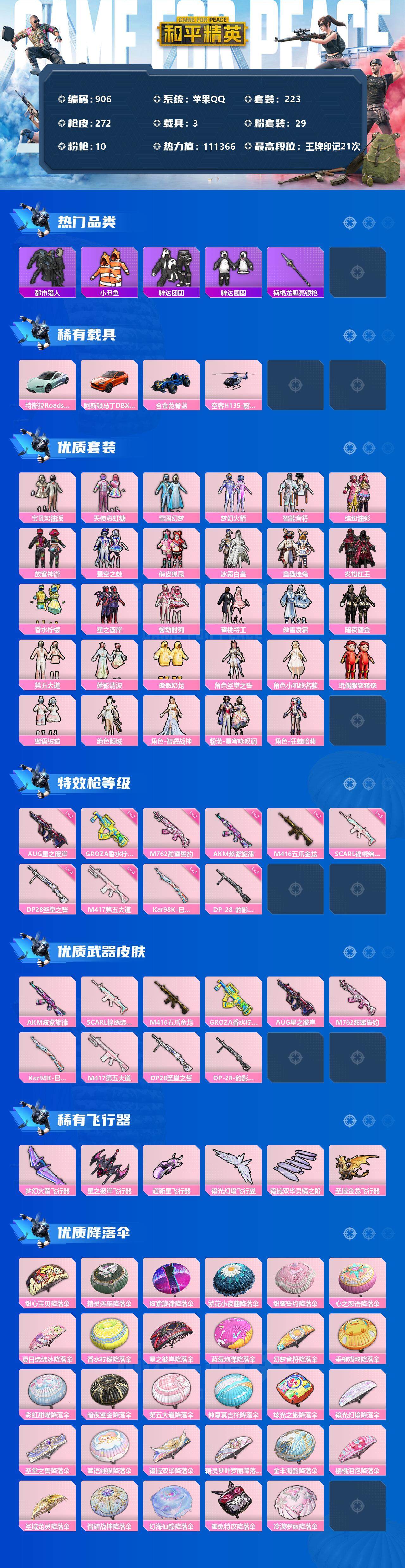 [12579100]苹果 手Q-29粉装-10特效枪-3载具-6粉色飞行器-111366热力值-21王牌印记-223套装-272枪皮 【热门品类】:粉装-雪国幻梦,粉装-梦幻火箭,粉装-童趣迷兔,粉装-缤纷油彩,套装-浪漫天命,套装-都市猎人,套装-小丑鱼,套装-奇异狩猎者,套装-胖达团团,套装-胖达圆圆,套装-龟仙人,套装-暗影哥特,套装-浪漫波比,套装-糯粉咩咩,撬棍-龙胆亮银枪 【粉色载具】:特斯拉Roadster(水滴蓝),阿斯顿马丁DBX(橙),合金龙骨(蓝),空客H135-蔚蓝之翼 【粉色套装】:粉装-宝贝奶油派,粉装-天使彩虹糖,粉装-雪国幻梦,粉装-梦幻火箭,粉装-智能音符,粉装-缤纷油彩,粉装-放客神游,粉装-星空之魅,粉装-俏皮狐尾,粉装-冰霜白皇,粉装-童趣迷兔,粉装-炙焰红王,粉装-香水柠檬,粉装-星之彼岸,粉装-馨动时刻,粉装-蜜桃特工,粉装-傲雪凌霜,粉装-暗夜鎏金,粉装-第五大道,粉装-莲影清波,粉装-傲傲奶龙,角色-圣堂之誓,角色-小叽联名款,玩偶服-猪猪侠,粉装-蜜语绒猫,角色-绝色倾城,角色-智耀战神,粉装-星穹咏叹调,角色-狂魅哈莉 【粉色枪皮等级】:AKM-炫紫旋律(七级),SCAR-L-锦绣绵绵(五级),M416-五爪金龙(七级),GROZA-香水柠檬(七级),AUG-星之彼岸(七级),M762-甜蜜誓约(七级),Kar98K-巳巳如意(一级),M417-第五大道(四级),DP-28-圣堂之誓(四级),DP-28-豹影疾电(一级) 【粉色枪皮】:AKM-炫紫旋律,SCAR-L-锦绣绵绵,M416-五爪金龙,GROZA-香水柠檬,AUG-星之彼岸,M762-甜蜜誓约,Kar98K-巳巳如意,M417-第五大道,DP-28-圣堂之誓,DP-28-豹影疾电 【粉色飞行器】:梦幻火箭飞行器,星之彼岸飞行器,超新星飞行器,镜光幻境飞行翼,镜域双华-灵镜之阶,圣域金龙飞行器 【粉色降落伞】:甜心宝贝降落伞,精灵迷巫降落伞,炫紫旋律降落伞,繁花小夜曲降落伞,甜蜜誓约降落伞,心之恋语降落伞,夏日绵绵冰降落伞,香水柠檬降落伞,星之彼岸降落伞,蓝莓炮弹降落伞,幻梦音符降落伞,垂柳戏鸭降落伞,彩虹甜喵降落伞,暗夜鎏金降落伞,第五大道降落伞,仲夏莫吉托降落伞,炫光之旅降落伞,镜光幻境降落伞,圣堂之誓降落伞,蜜语绒猫降落伞,镜域双华降落伞,精灵梦叶罗丽降落伞,金丰海韵
