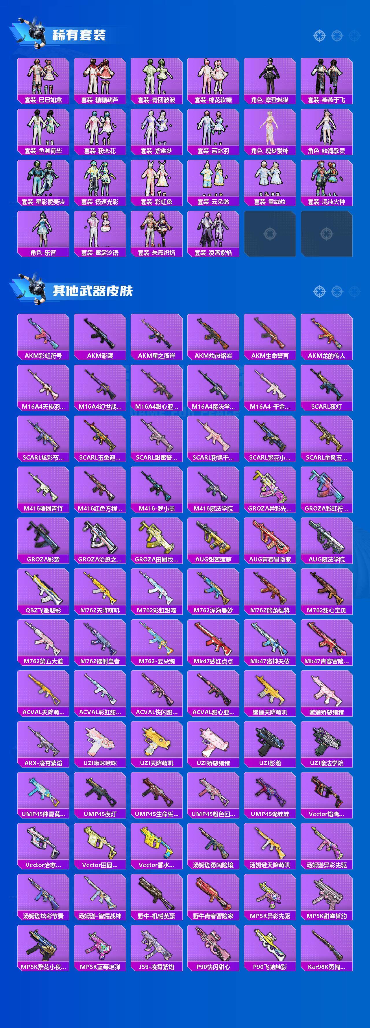 AKM-炫紫旋律,M416-五爪金龙,GROZA-香水柠檬,AUG-星之彼岸,M762-甜蜜誓约,Kar98K-巳巳如意,M417-第五大道,DP-28-圣堂之誓
