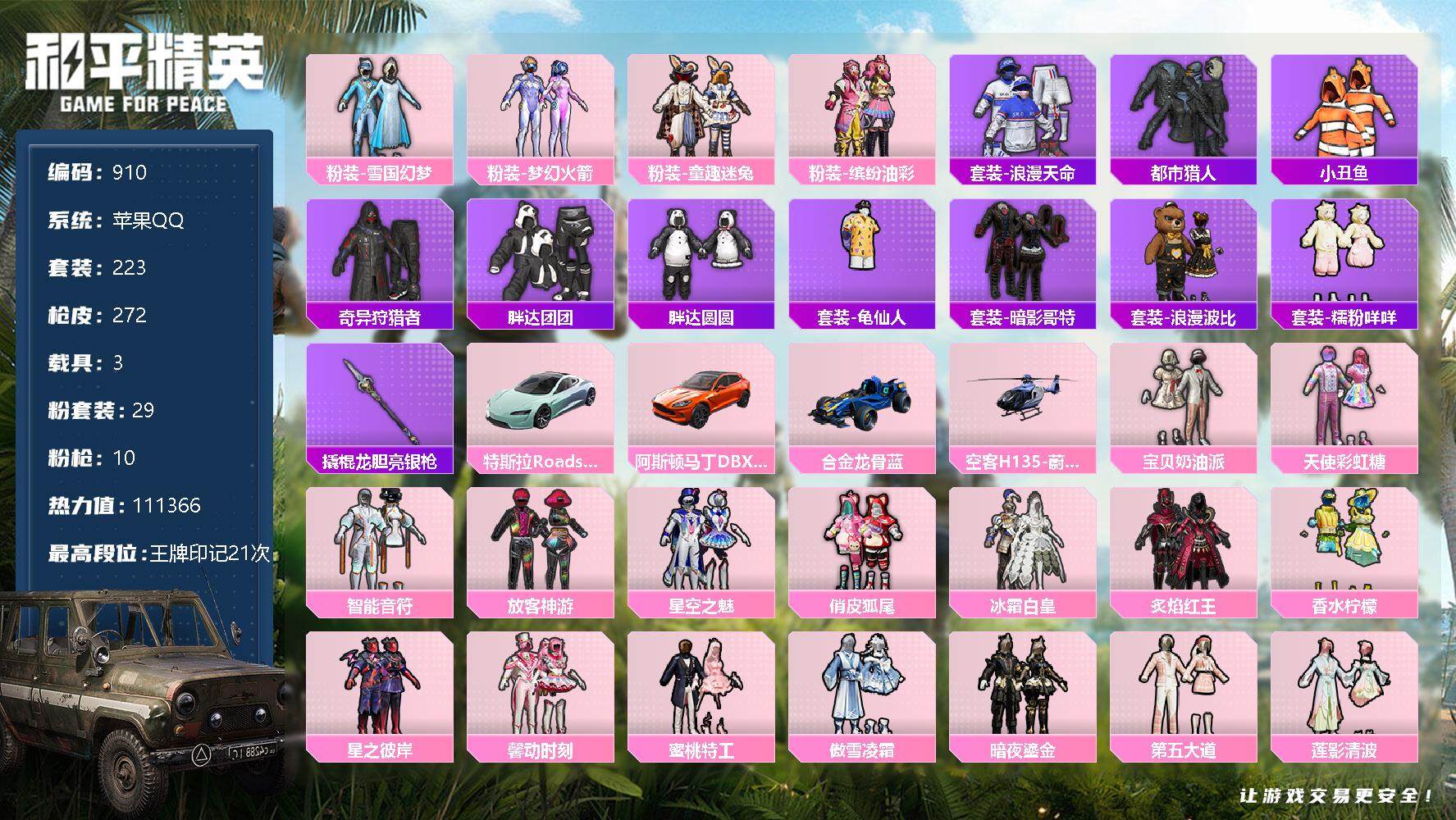 [12579131]苹果 手Q-29粉装-10特效枪-3载具-6粉色飞行器-111366热力值-21王牌印记-223套装-272枪皮 【热门品类】:粉装-雪国幻梦,粉装-梦幻火箭,粉装-童趣迷兔,粉装-缤纷油彩,套装-浪漫天命,套装-都市猎人,套装-小丑鱼,套装-奇异狩猎者,套装-胖达团团,套装-胖达圆圆,套装-龟仙人,套装-暗影哥特,套装-浪漫波比,套装-糯粉咩咩,撬棍-龙胆亮银枪 【粉色载具】:特斯拉Roadster(水滴蓝),阿斯顿马丁DBX(橙),合金龙骨(蓝),空客H135-蔚蓝之翼 【粉色套装】:粉装-宝贝奶油派,粉装-天使彩虹糖,粉装-雪国幻梦,粉装-梦幻火箭,粉装-智能音符,粉装-缤纷油彩,粉装-放客神游,粉装-星空之魅,粉装-俏皮狐尾,粉装-冰霜白皇,粉装-童趣迷兔,粉装-炙焰红王,粉装-香水柠檬,粉装-星之彼岸,粉装-馨动时刻,粉装-蜜桃特工,粉装-傲雪凌霜,粉装-暗夜鎏金,粉装-第五大道,粉装-莲影清波,粉装-傲傲奶龙,角色-圣堂之誓,角色-小叽联名款,玩偶服-猪猪侠,粉装-蜜语绒猫,角色-绝色倾城,角色-智耀战神,粉装-星穹咏叹调,角色-狂魅哈莉 【粉色枪皮等级】:AKM-炫紫旋律(七级),SCAR-L-锦绣绵绵(五级),M416-五爪金龙(七级),GROZA-香水柠檬(七级),AUG-星之彼岸(七级),M762-甜蜜誓约(七级),Kar98K-巳巳如意(一级),M417-第五大道(四级),DP-28-圣堂之誓(四级),DP-28-豹影疾电(一级) 【粉色枪皮】:AKM-炫紫旋律,SCAR-L-锦绣绵绵,M416-五爪金龙,GROZA-香水柠檬,AUG-星之彼岸,M762-甜蜜誓约,Kar98K-巳巳如意,M417-第五大道,DP-28-圣堂之誓,DP-28-豹影疾电 【粉色飞行器】:梦幻火箭飞行器,星之彼岸飞行器,超新星飞行器,镜光幻境飞行翼,镜域双华-灵镜之阶,圣域金龙飞行器 【粉色降落伞】:甜心宝贝降落伞,精灵迷巫降落伞,炫紫旋律降落伞,繁花小夜曲降落伞,甜蜜誓约降落伞,心之恋语降落伞,夏日绵绵冰降落伞,香水柠檬降落伞,星之彼岸降落伞,蓝莓炮弹降落伞,幻梦音符降落伞,垂柳戏鸭降落伞,彩虹甜喵降落伞,暗夜鎏金降落伞,第五大道降落伞,仲夏莫吉托降落伞,炫光之旅降落伞,镜光幻境降落伞,圣堂之誓降落伞,蜜语绒猫降落伞,镜域双华降落伞,精灵梦叶罗丽降落伞,金丰海韵