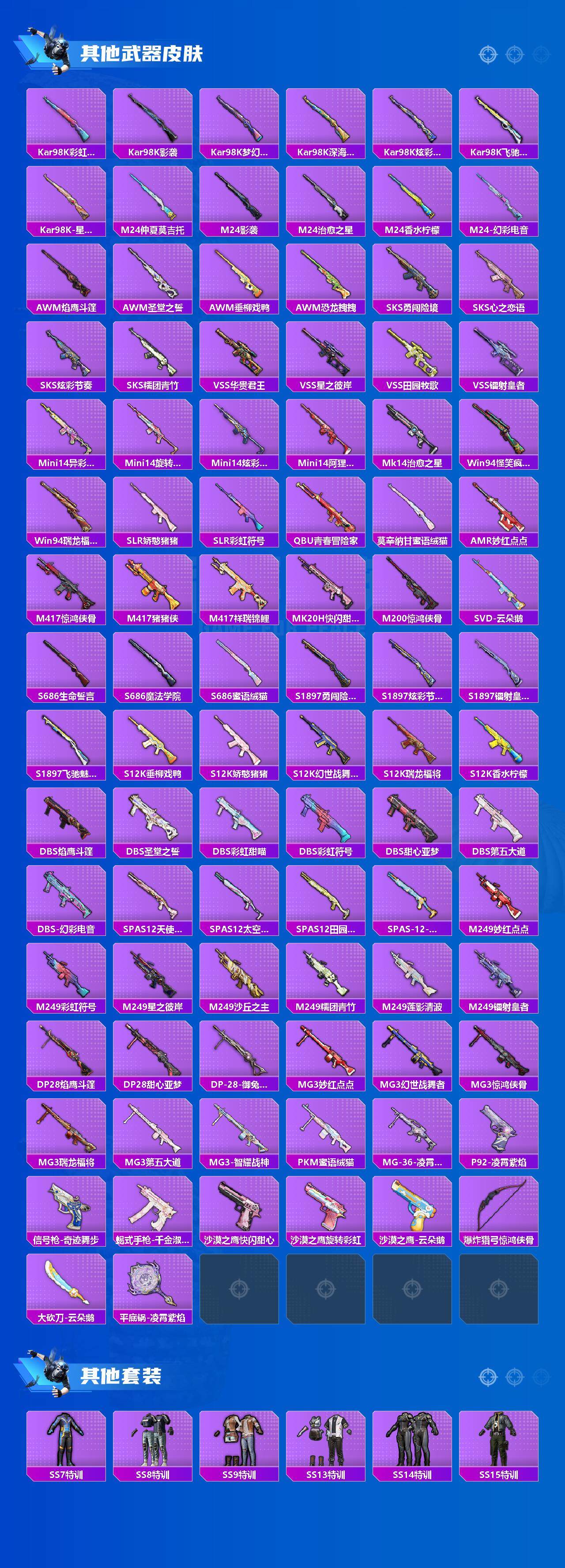 AKM-炫紫旋律,M416-五爪金龙,GROZA-香水柠檬,AUG-星之彼岸,M762-甜蜜誓约,Kar98K-巳巳如意,M417-第五大道,DP-28-圣堂之誓