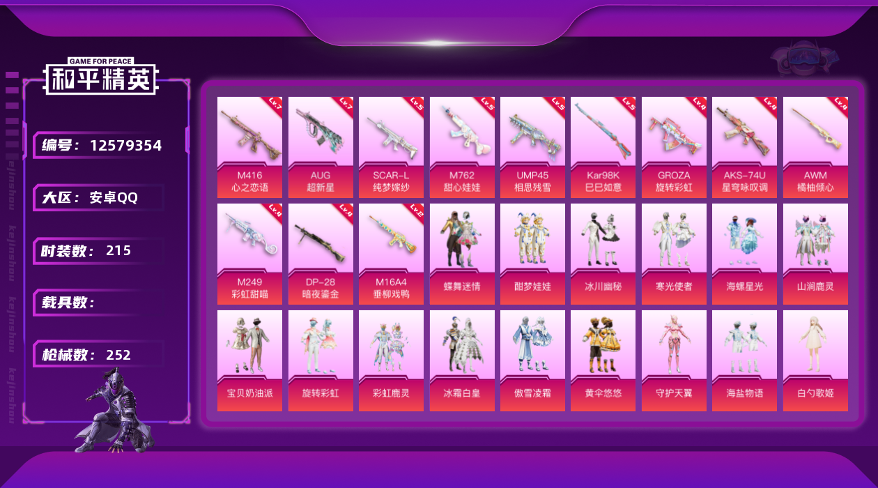 - PX_2088313- 可二次 安卓手Q-2王牌印记-14粉装-3特效枪-2载具-93159热力值-234套装-245枪皮-0卓越印记-0传奇印记, 【14粉装】,新星烈龙,极致幻想,深渊皇后,精灵迷巫,华贵君王,甜蜜誓约,王牌四分卫,潮汐统领,天禅智恒,向日葵,心之恋语,桀骜红莲,金风玉露,蜜桃特工, 【3特效枪】,M416-心之恋语-6级,M762-甜蜜誓约-7级,Kar98K-伏魔团-5级,