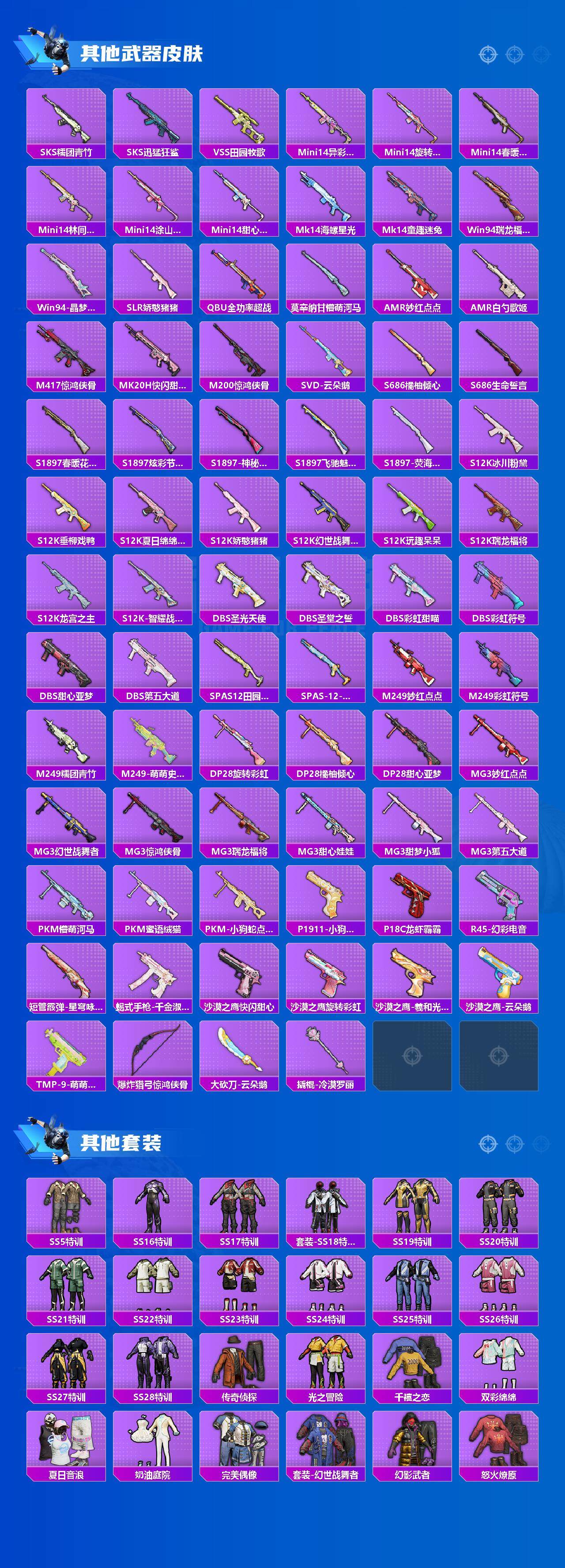 【粉色枪皮】:M16A4-垂柳戏鸭,SCAR-L-纯梦嫁纱,M416-心之恋语,GROZA-旋转彩虹,AUG-超新星,M762-甜心娃娃,UMP45-相思残雪,AKS-74U-星穹咏叹调,Kar98K-巳巳如意,AWM-橘柚倾心,M249-彩虹甜喵,DP-28-暗夜鎏金