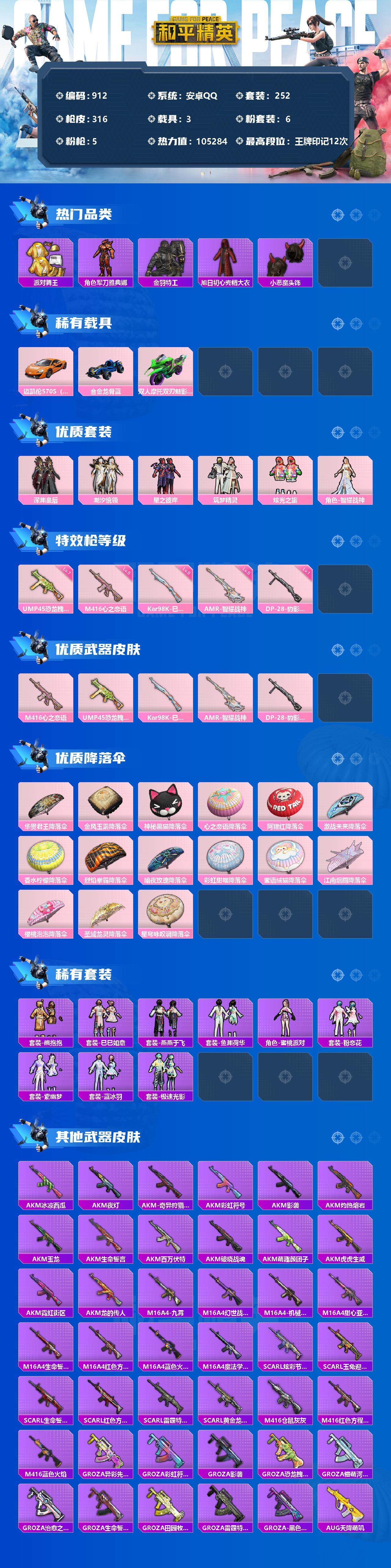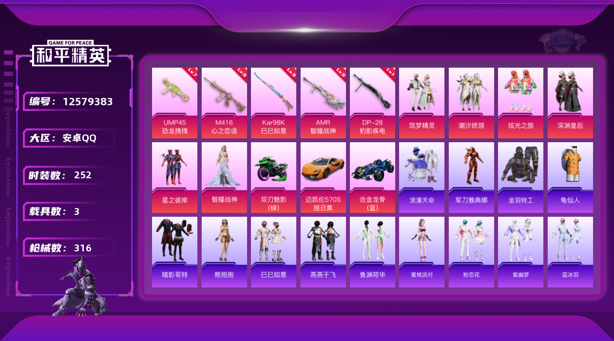 [12579383]安卓 手Q-6粉装-5特效枪-3载具-0粉色飞行器-105284热力值-12王牌印记-252套装-316枪皮 【热门品类】:套装-浪漫天命,套装-派对舞王,角色-军刀雅典娜,套装-金羽特工,旭日初心兜帽大衣,套装-龟仙人,套装-潮萌小黄鸭,套装-暗影哥特,套装-浪漫波比,小恶魔头饰 【粉色载具】:迈凯伦570S(旭日黄),合金龙骨(蓝),双人摩托-双刃魅影(绿) 【粉色套装】:粉装-深渊皇后,粉装-潮汐统领,粉装-星之彼岸,粉装-筑梦精灵,粉装-炫光之旅,角色-智耀战神 【粉色枪皮等级】:M416-心之恋语(五级),UMP45-恐龙拽拽(七级),Kar98K-巳巳如意(五级),AMR-智耀战神(五级),DP-28-豹影疾电(一级) 【粉色枪皮】:M416-心之恋语,UMP45-恐龙拽拽,Kar98K-巳巳如意,AMR-智耀战神,DP-28-豹影疾电 【粉色降落伞】:华贵君王降落伞,金风玉露降落伞,神秘黑猫降落伞,心之恋语降落伞,阿狸红降落伞,激战未来降落伞,香水柠檬降落伞,烈焰拳霸降落伞,暗夜玫瑰降落伞,彩虹甜喵降落伞,蜜语绒猫降落伞,江南烟雨降落伞,樱桃泡泡降落伞,圣域龙灵降落伞,星穹咏叹调降落伞 【稀有套装】:套装-龟仙人,套装-熊抱抱,套装-巳巳如意,套装-燕燕于飞,套装-鱼渊荷华,角色-蜜桃派对,套装-粉恋花,套装-紫幽梦,套装-蓝冰羽,套装-极速光影 【稀有枪皮】:AKM-冰凉西瓜,AKM-夜灯,AKM-奇异狩猎者,AKM-彩虹符号,AKM-影袭,AKM-灼热熔岩,AKM-玉龙,AKM-生命誓言,AKM-百万伏特,AKM-破晓战魂,AKM-萌趣颜团子,AKM-虎虎生威,AKM-霓虹街区,AKM-龙的传人,M16A4-九霄,M16A4-幻世战舞者,M16A4-机械英豪,M16A4-甜心亚梦,M16A4-生命誓言,M16A4-红色方程式,M16A4-蓝色火焰,M16A4-魔法学院,SCAR-L-炫彩节奏,SCAR-L-玉兔迎春,SCAR-L-生命誓言,SCAR-L-红色方程式,SCAR-L-雷霆特警,SCAR-L-黄金龙骨,M416-仓鼠灰灰,M416-红色方程式,M416-蓝色火焰,GROZA-异彩先驱,GROZA-彩虹符号,GROZA-影袭,GROZA-恐龙拽拽,GROZA-懵萌河马,GROZA-治愈之星,GROZA-生命誓言,GROZA-田园牧歌,GR