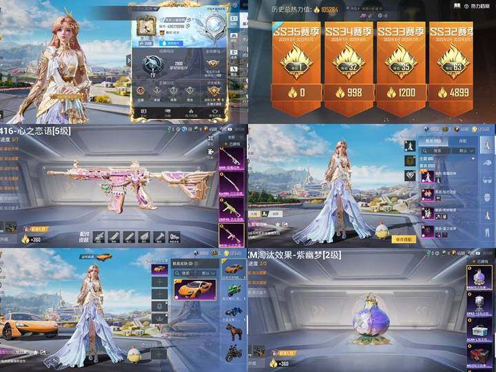 【粉色枪皮等级】:M416-心之恋语(五级),UMP45-恐龙拽拽(七级),Kar98K-巳巳如意(五级),AMR-智耀战神(五级),DP-28-豹影疾电(一级)