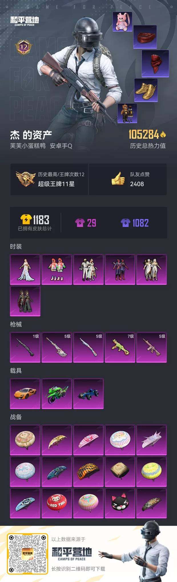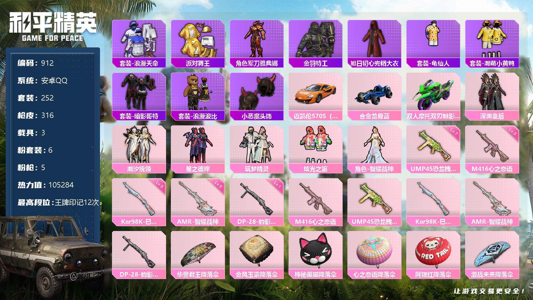 [12579383]安卓 手Q-6粉装-5特效枪-3载具-0粉色飞行器-105284热力值-12王牌印记-252套装-316枪皮