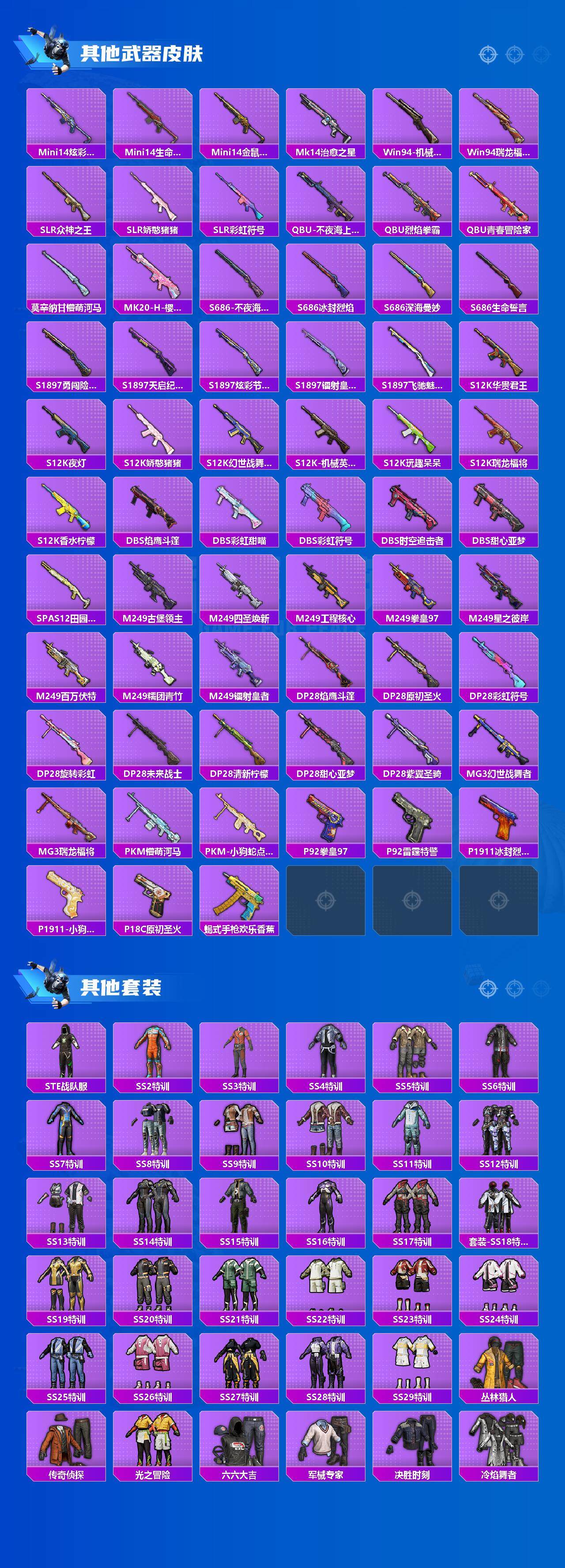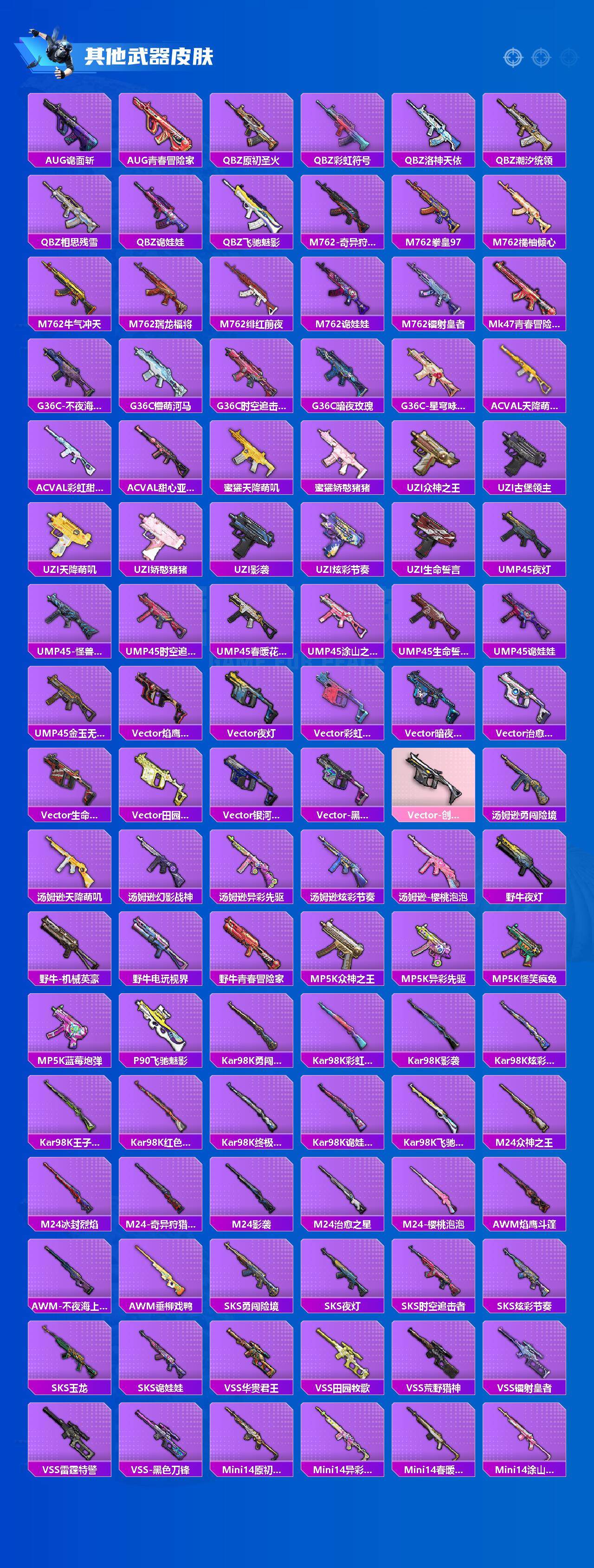 【稀有枪皮】:AKM-冰凉西瓜,AKM-夜灯,AKM-奇异狩猎者,AKM-彩虹符号,AKM-影袭,AKM-灼热熔岩,AKM-玉龙,AKM-生命誓言,AKM-百万伏特,AKM-破晓战魂,AKM-萌趣颜团子,AKM-虎虎生威,AKM-霓虹街区,AKM-龙的传人,M16A4-九霄,M16A4-幻世战舞者,M16A4-机械英豪,M16A4-甜心亚梦,M16A4-生命誓言,M16A4-红色方程式,M16A4-蓝色火焰,M16A4-魔法学院,SCAR-L-炫彩节奏,SCAR-L-玉兔迎春,SCAR-L-生命誓言,SCAR-L-红色方程式,SCAR-L-雷霆特警,SCAR-L-黄金龙骨,M416-仓鼠灰灰,M416-红色方程式,M416-蓝色火焰,GROZA-异彩先驱,GROZA-彩虹符号,GROZA-影袭,GROZA-恐龙拽拽,GROZA-懵萌河马,GROZA-治愈之星,GROZA-生命誓言,GROZA-田园牧歌,GR