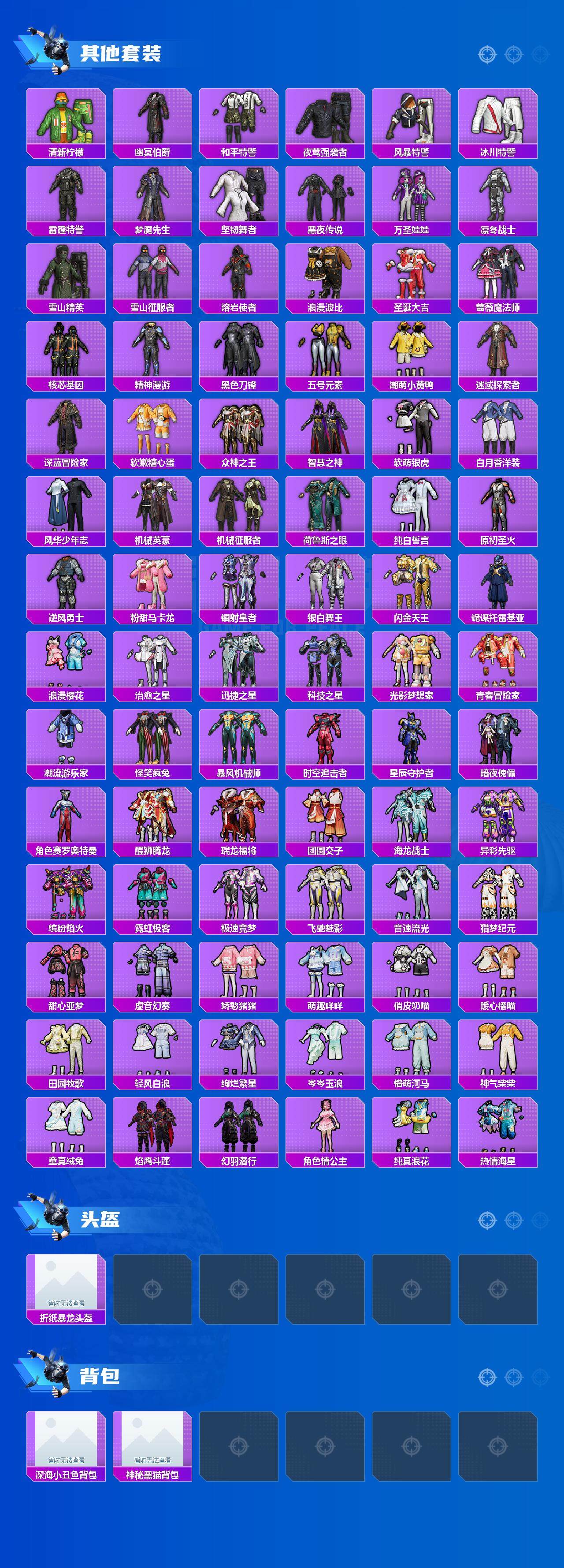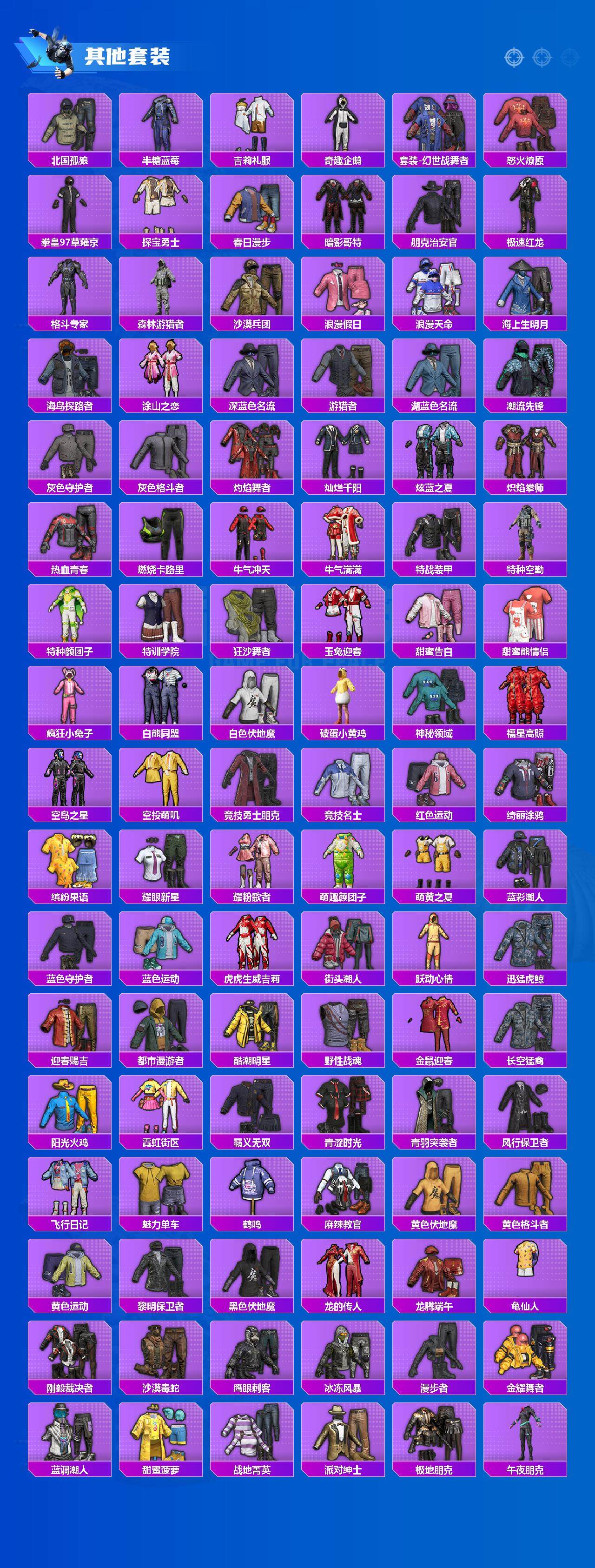 套装-浪漫天命,角色-军刀雅典娜,套装-金羽特工,套装-龟仙人,套装-暗影哥特,套装-极速红龙,套装-狂沙舞者,套装-破蛋小黄鸡,套装-漫步者,套装-幽冥伯爵,套装-雪山精英,套装-黑色刀锋,套装-软嫩糖心蛋,白月香洋装套装,风华少年志套装,套装-机械英豪,套装-纯白誓言,粉甜马卡龙套装,套装-怪笑疯兔,角色-赛罗奥特曼,套装-醒狮腾龙,套装-瑞龙福将,套装-团圆交子