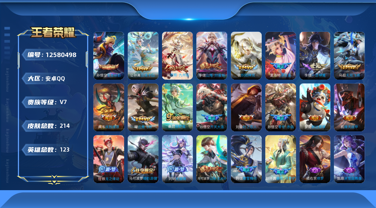 [12580498]安卓Q-V7-至尊星耀IV段位-123英雄-214皮肤-1典藏-0珍品无双-0无双-0珍品传说-15传说-61史诗