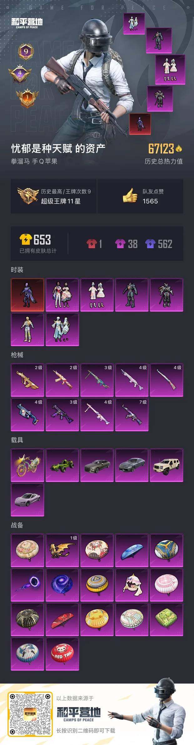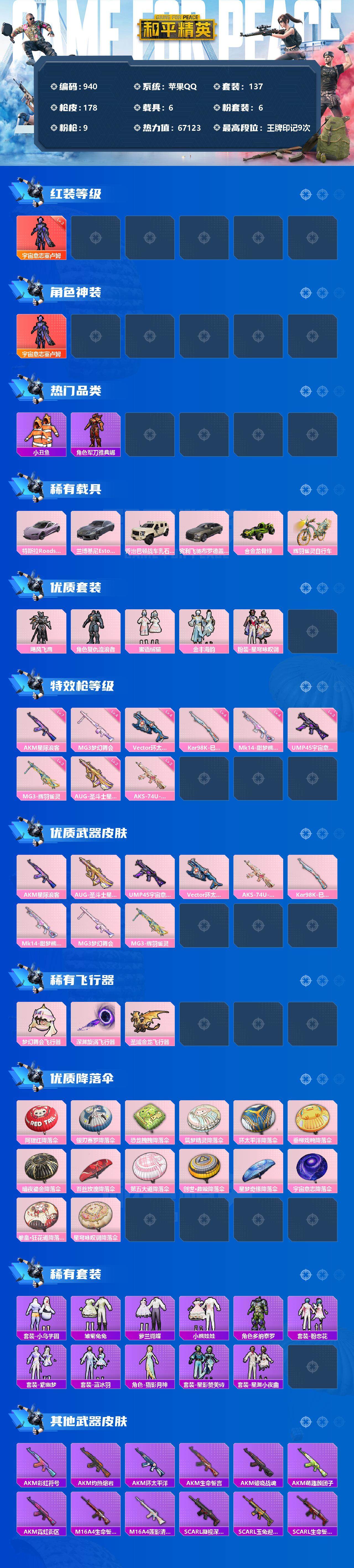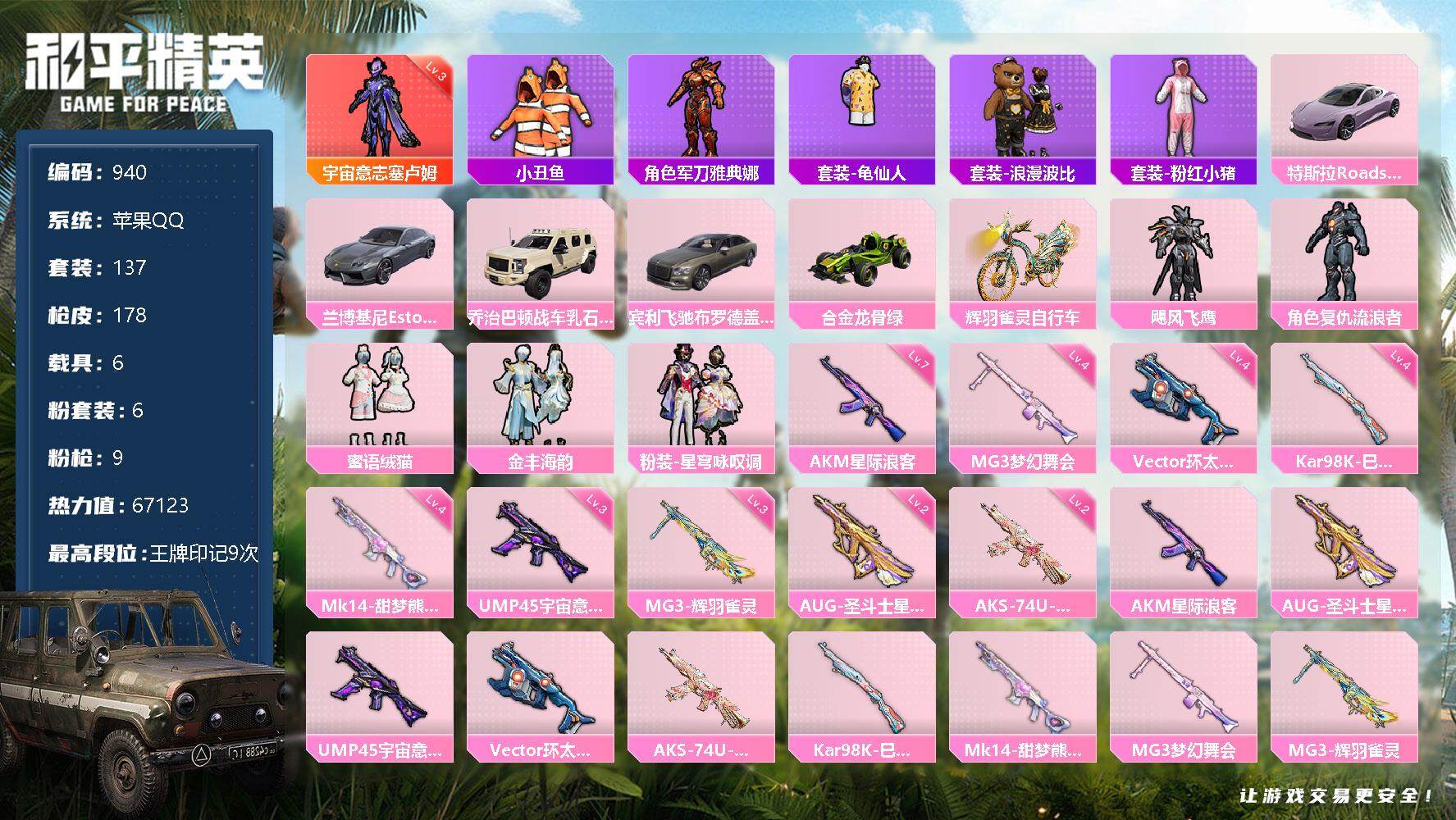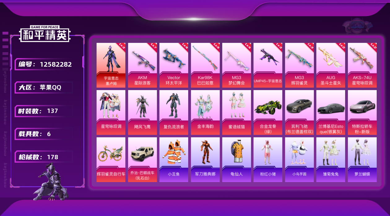[12582282]苹果 手Q-1神装-6粉装-9特效枪-6载具-3粉色飞行器-67123热力值-9王牌印记-137套装-178枪皮